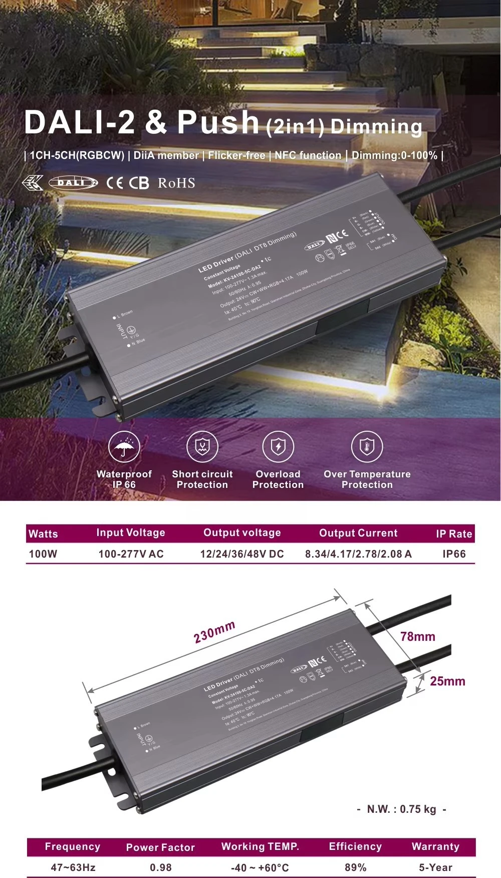 Starwell DALI Tentsio Konstante DT8 Dimmable Led Driver Zehaztapena: