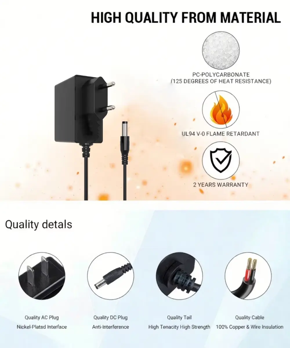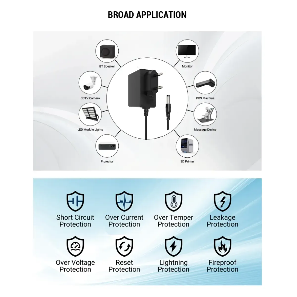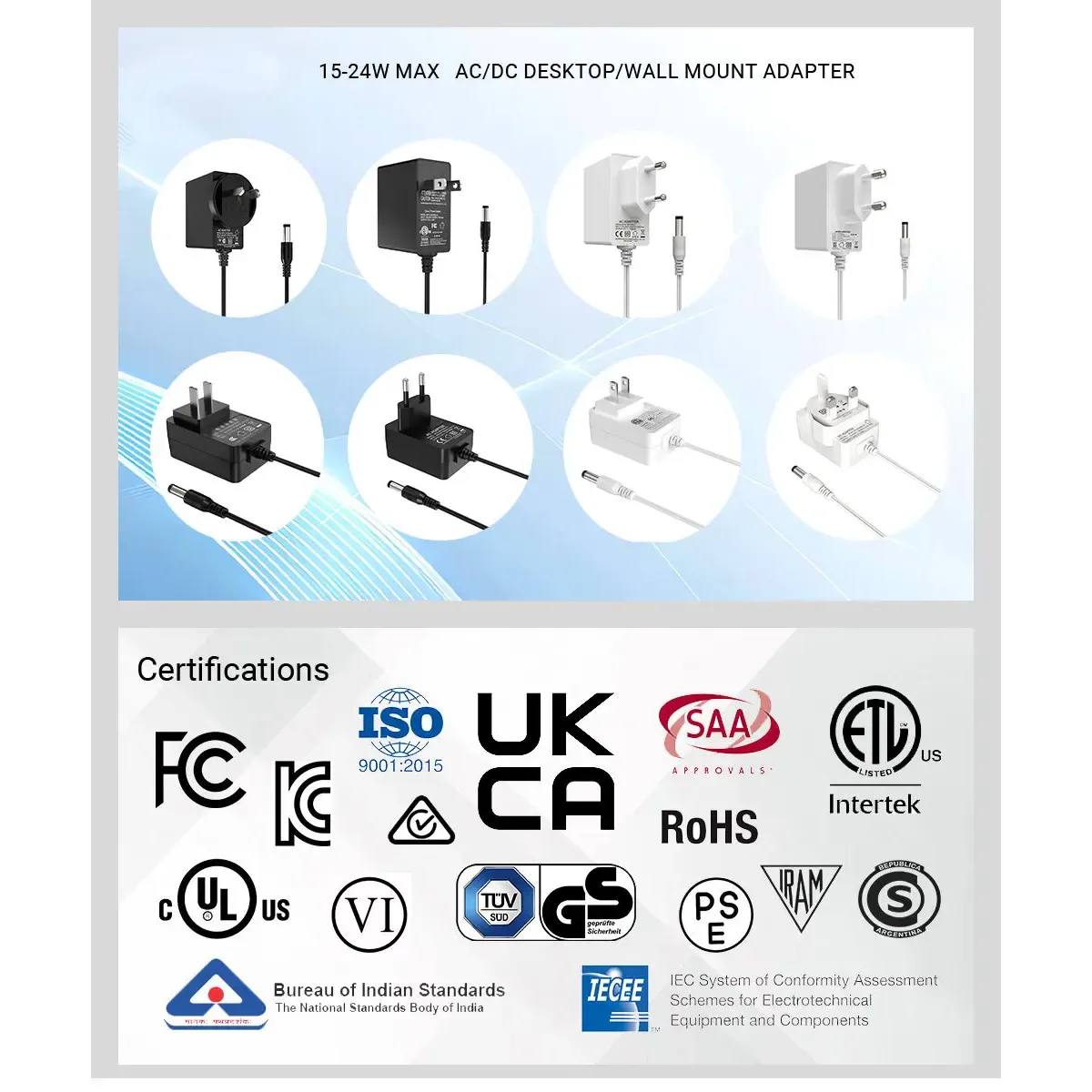 24 W potentzia-egokigailu serieak nazioarteko estandar zorrotzak betetzen ditu eta ziurtagiri globalak ditu, besteak beste, CE/FCC/UL/RCM/SAA/UKCE/KC/BIS/PSE ziurtagiria, segurtasuna eta ingurumena betetzen direla bermatuz. Europako entxufearen diseinuak konexio seguruak ahalbidetzen ditu, hainbat ezarpenetan erabiltzeko erraza da.