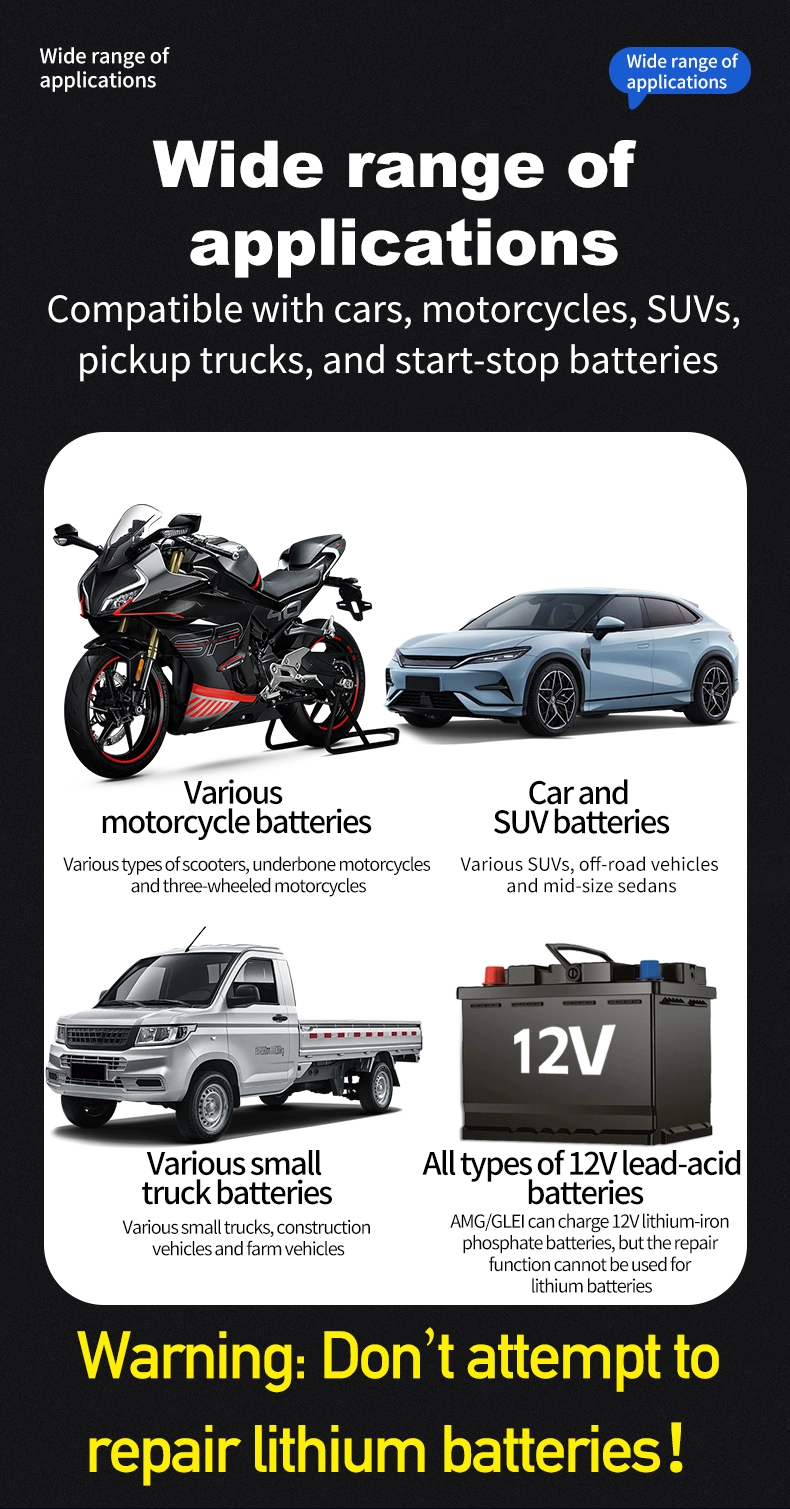 1. Bateragarritasun unibertsala eta bateria anitzeko euskarria: ezin hobeto funtzionatzen du 12 V-ko bateria mota guztiekin, berun-azidoa, AGM, Gela eta LiFePO4 barne, 6 Ah-tik 180 Ah-tik 180Ah-ko bateriaren ahalmenak barne. 110 ~ 230 V-ko sarrera-eremu zabalak eskualdeko mugak ezabatzen ditu, mundu osoko 100 herrialde eta eskualde baino gehiagotan erabilgarri bihurtuz.