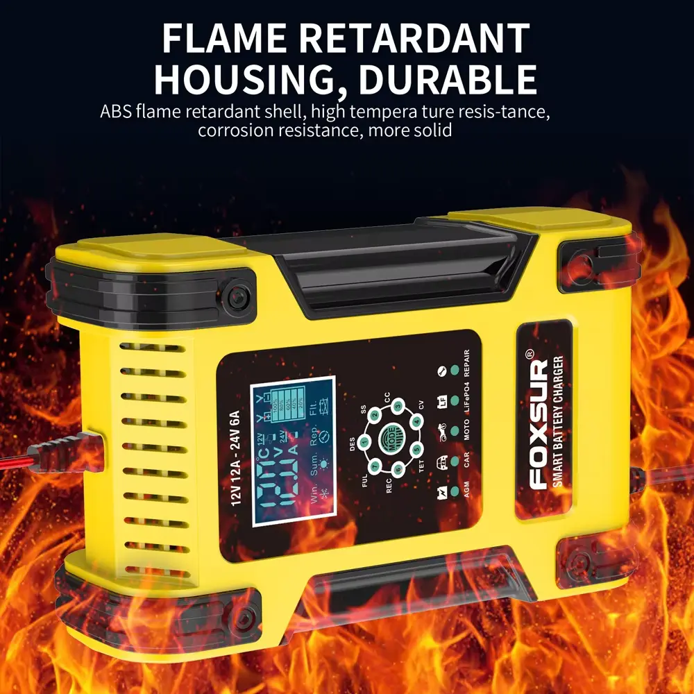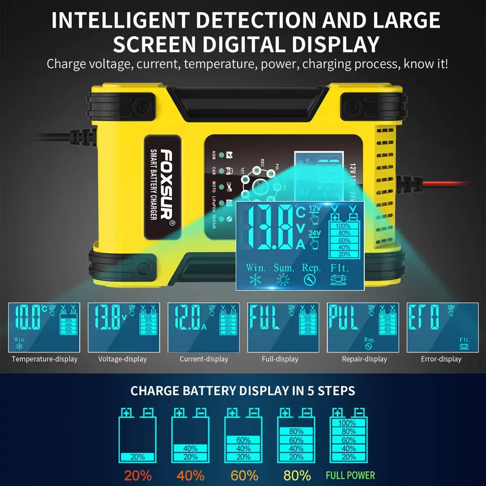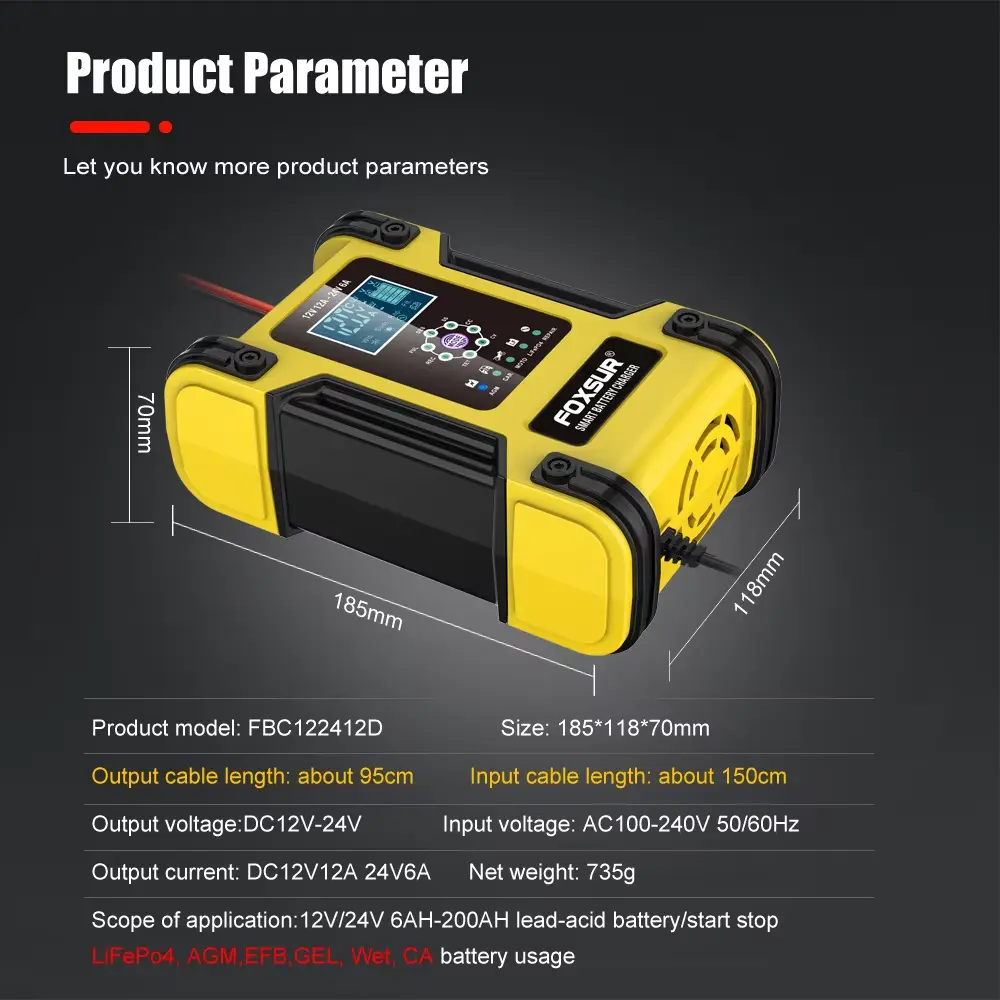 Merkatuko beste kargagailu batzuek ez bezala, 12V 24V 12A 7 segmentuko Berun-azidozko Bateria Kargagailu Adimendunak segurtasun-funtzio zabalak eskaintzen ditu zure bateria eta kargagailua bera babesteko.