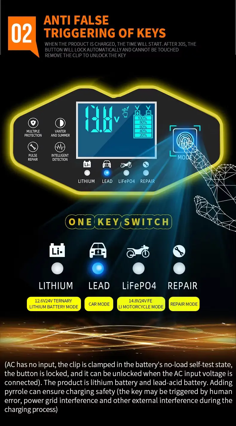 1. Adimentsua eta bateragarria ZYX-J40-k merkatuko ia bateria mota guztiak onartzen ditu, besteak beste, berun-azidoa, AGM, Gela, EFB, Li-ioia eta LiFePO₄ (litio-burdina fosfatoa). 2 Ah-tik 150Ah bitarteko edukiera zabalarekin, motozikleten bateria txikietatik hasi eta autoen bateria handietaraino maneiatzen du.