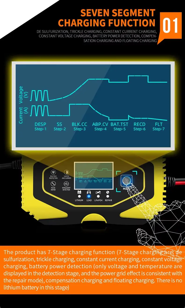 7 faseko kargatzeko programak bateriaren zainketa optimoa bermatzen du: desulfatazioa, abiarazte leuna, karga handia, xurgapena, analisia, birmoldaketa eta flotatzaileen mantentze-lanak. Etapa hauek elkarrekin funtzionatzen dute bateriaren iraupena luzatzeko, sulfatatutako bateriak berreskuratzeko eta gehiegizko karga saihesteko.