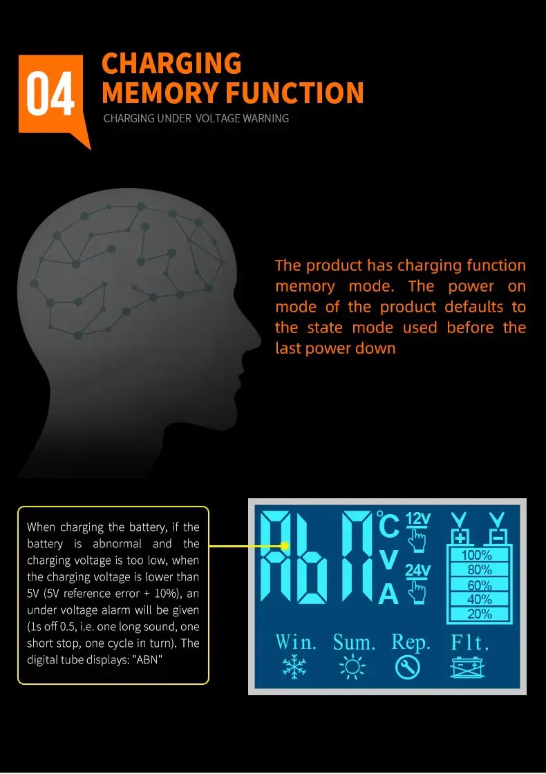 2. Kargatzeko errendimendu optimizatua Kargagailu honek 12V 6A-tan eta 24V 3A-tan ematen ditu, 110W-ko gehienezko irteerarekin eta %85eko karga-eraginkortasuna karga osoarekin. 7 faseko karga adimendun automatikoko programak desulfazioa, abiarazte leuna, karga handia, xurgapena, analisia, birmoldaketa eta flotatzaileen mantentze-lanak barne hartzen ditu. Neguko modu dedikatu batek tenperatura hotzetan kargatzea ziurtatzen du, eta LCD pantailak karga-tentsioa, korrontea eta bateriaren tenperatura denbora errealean kontrolatzeko aukera ematen dizu.