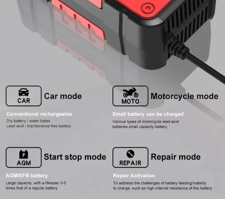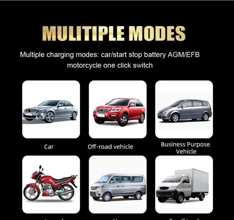 Aplikazio zabala: 12V Bateria-kargagailua auto, motozikletak, quad-ak, belar traktoreak, itsasontziak eta abarretarako egokia da.