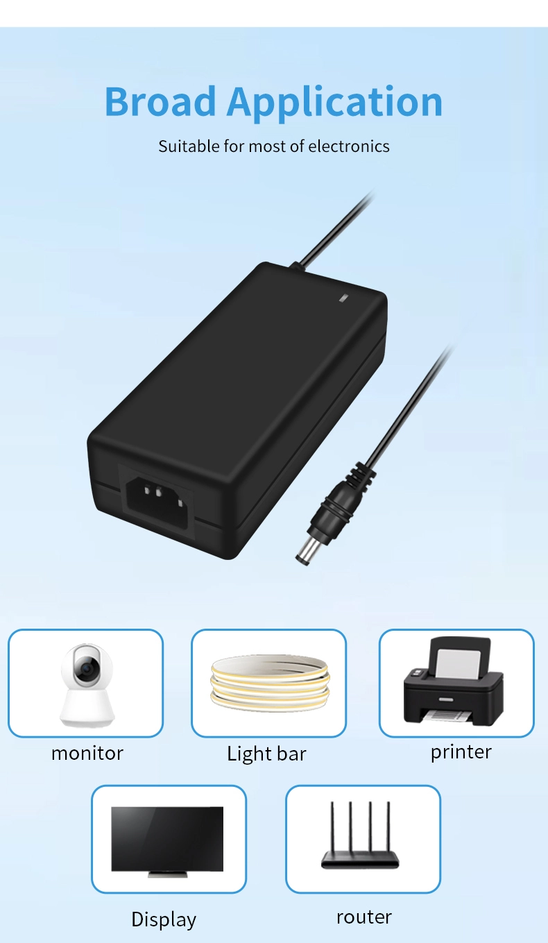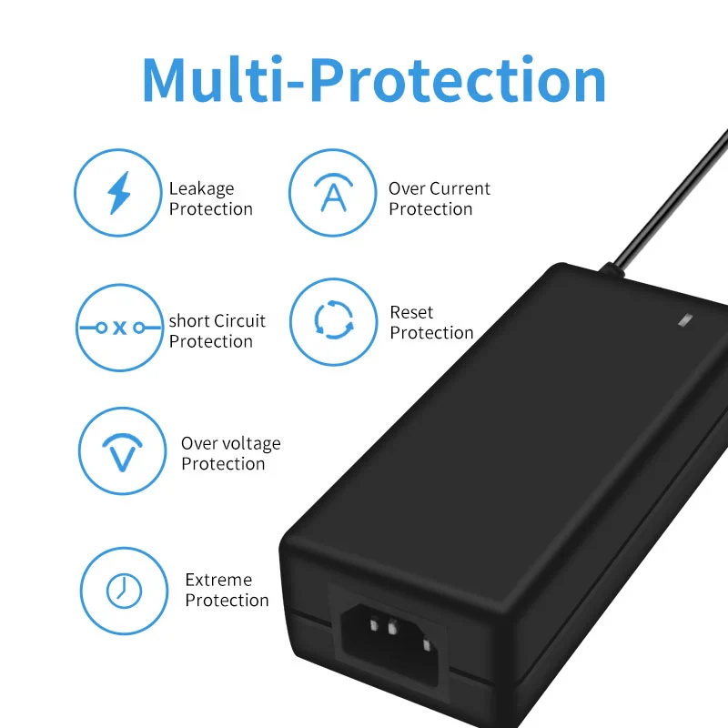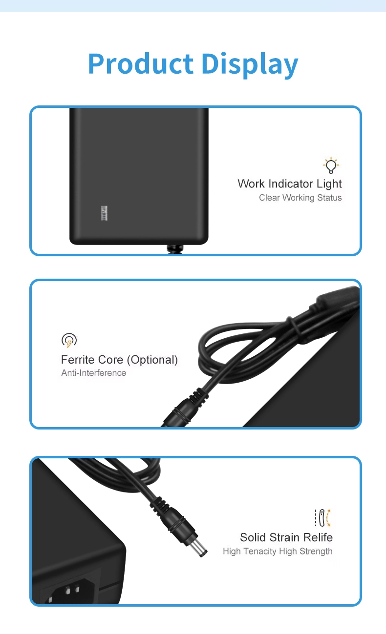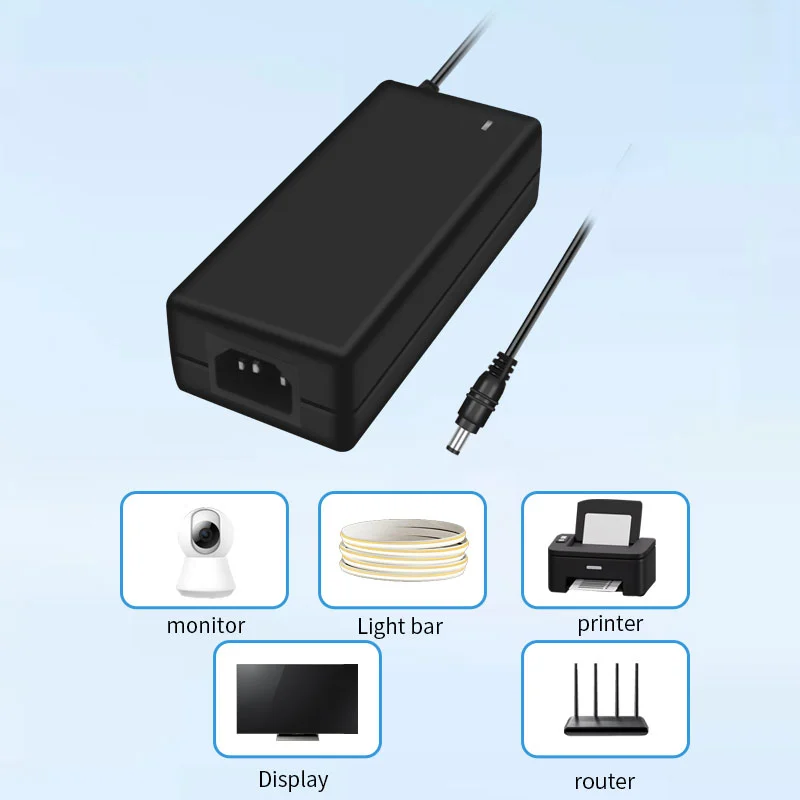 AC 100-240V tentsio zabaleko sarrera mundu osoko 100 herrialde baino gehiagoko sare elektrikoekin bateragarria da. 1,5 m-ko irteera-kable hedatua (1,0 mm²-ko diametroa) 180°-ko DC konektore biragarri batekin konbinatuta hainbat instalazio-egoeratara egokitzen da. 120 × 60 × 30 mm-ko tamaina trinkoarekin, potentzia bereko egokitzaile tradizionalak baino % 35 txikiagoa da, 280 g besterik ez du pisua, eta eramangarritasuna % 50 hobetzen du.