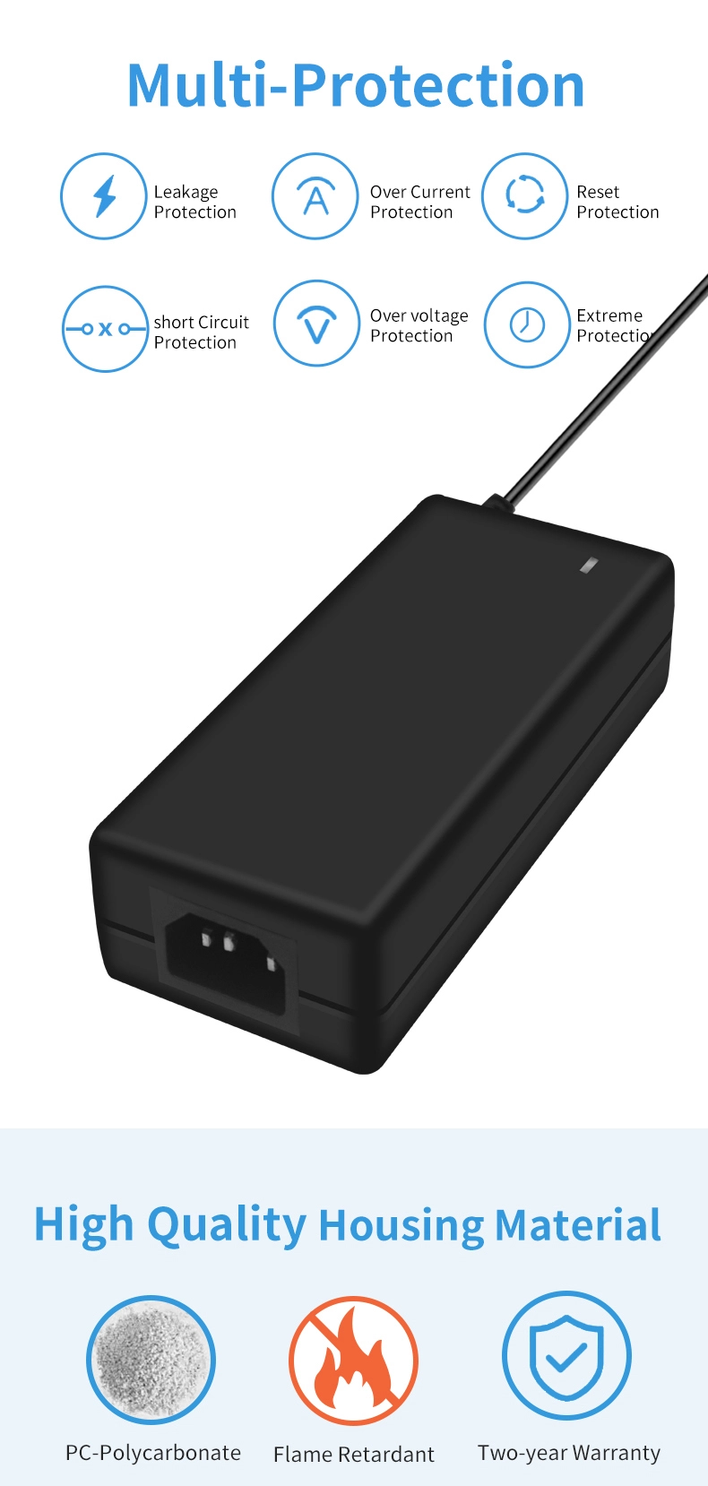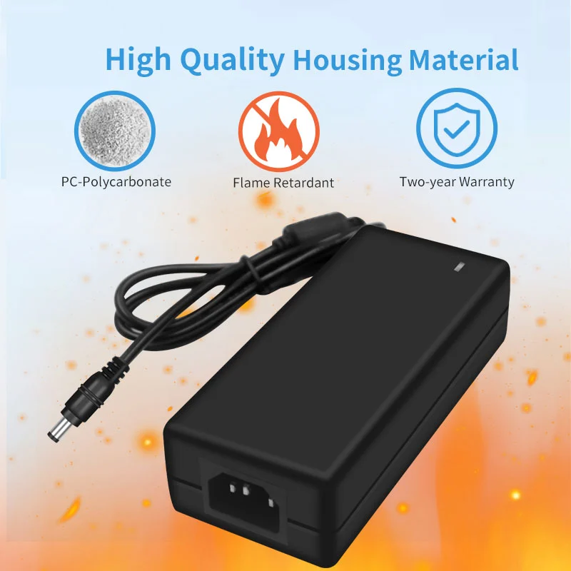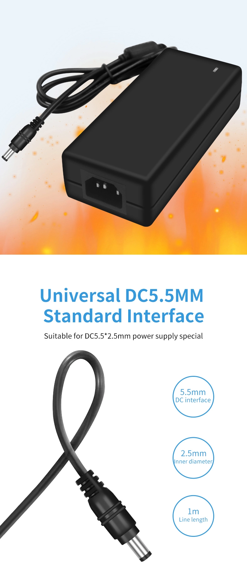 AC 100-240V tentsio zabaleko sarrera mundu osoko 100 herrialde baino gehiagoko sare elektrikoekin bateragarria da. 1,5 m-ko irteera-kable hedatua (1,0 mm²-ko diametroa) 180°-ko DC konektore biragarri batekin konbinatuta hainbat instalazio-egoeratara egokitzen da. 120 × 60 × 30 mm-ko tamaina trinkoarekin, potentzia bereko egokitzaile tradizionalak baino % 35 txikiagoa da, 280 g besterik ez du pisua, eta eramangarritasuna % 50 hobetzen du.