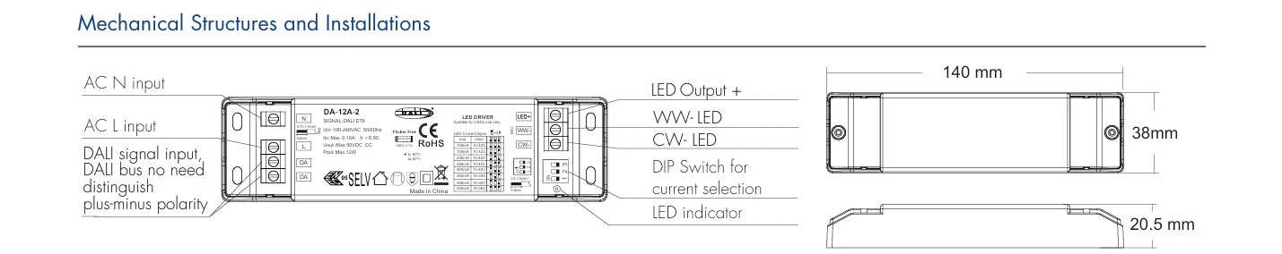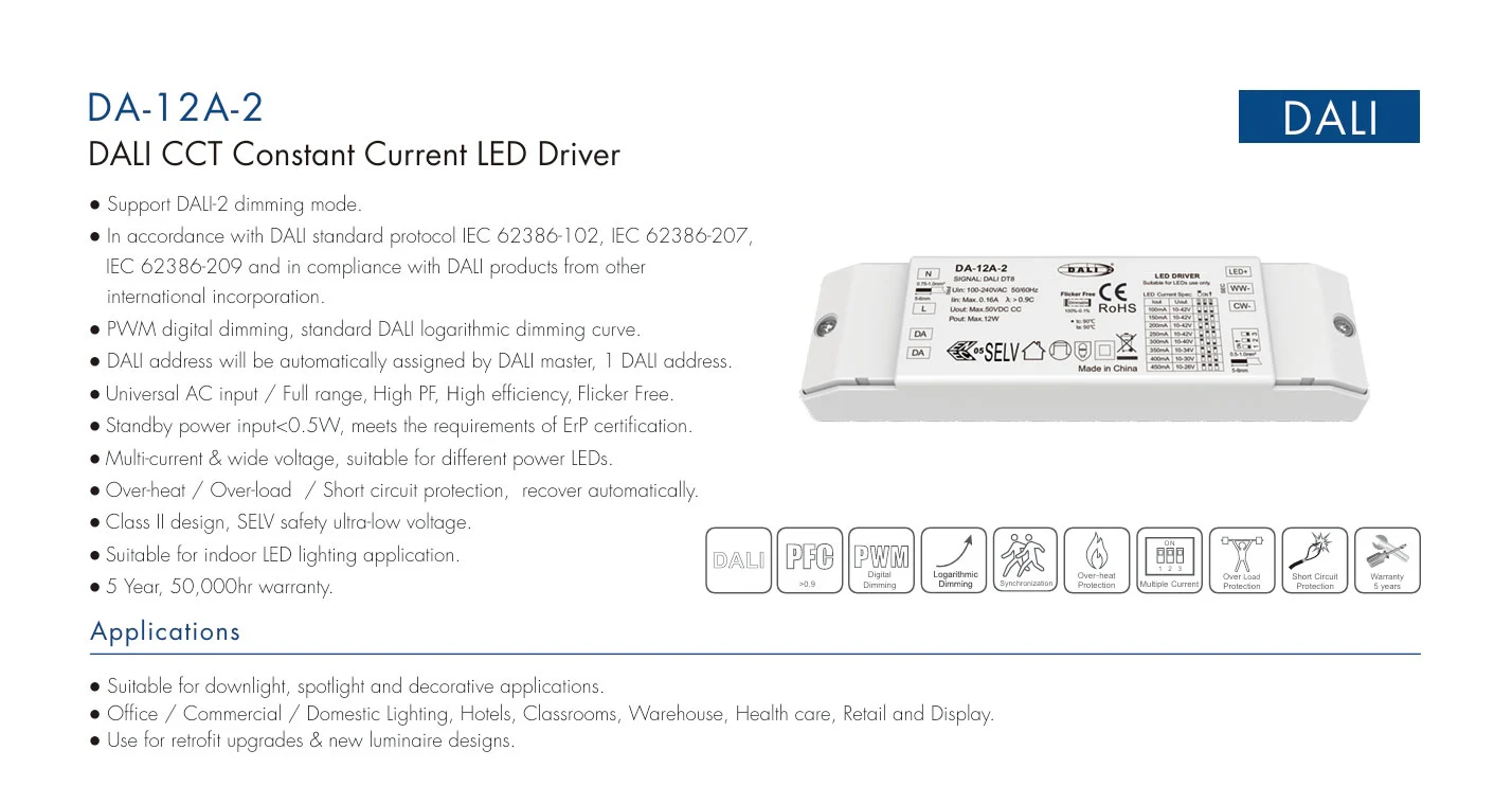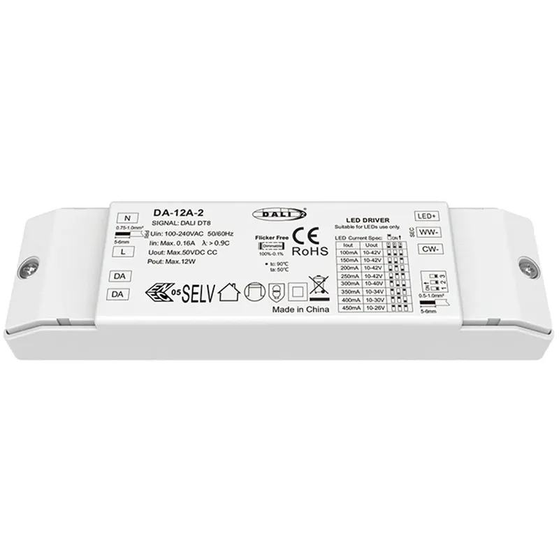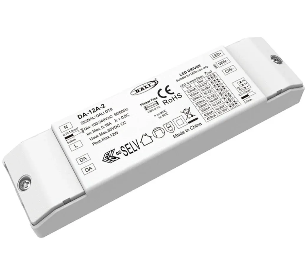 IP20 kaxa trinko batean kokatuta, Dimmable LED Driver honek instalazioa errazten du espazio mugatuetan ere, hala nola LED profilak edo aparatuetarako. Korronte Konstanteko irteera, CCT sintonizazio zabala eta DALI-2 industria estandarraren bateragarritasuna konbinatuz, downlight zuri doigarrietarako, tresna linealetarako eta argiztapen arkitektonikoaren gidari aproposa eta etorkizunerako balio du, argiztapen adimendunaren ekosistema modernoetan ezin hobeto integratuz, korronte konstanteko DALI CCT LED kontrolatzaile polifazetiko gisa.