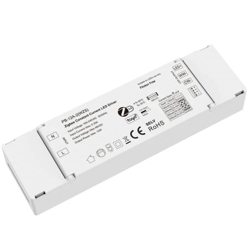 12W TUYA Zigbee CCT Dimmable LED Driver-ek % 85 arteko bihurketa-eraginkortasun handia dute, potentzia-faktorea ≥ 0,90 eta kargarik gabeko potentzia-kontsumo baxua, energia xahutzea eraginkortasunez murrizten du. Eraikitako babes osoak, gaintentsioa, korrontea, zirkuitulaburra eta tenperatura gainditzea barne, funtzionamendu segurua eta egonkorra bermatzen dute. Itxitura trinkoa eta suaren aurkakoa hartuta, oso erabilia da etxe adimendunetan, hoteletan, bulegoetan eta txikizkako argiztapen zuri doigarrietan, iluntze adimendun errendimendu fidagarria eta erabilerraza eskaintzen duena.