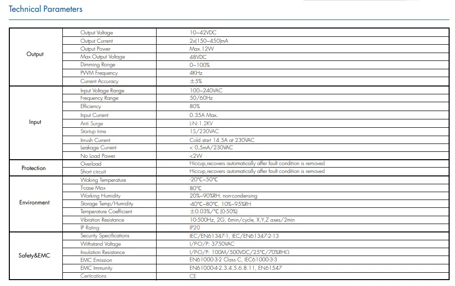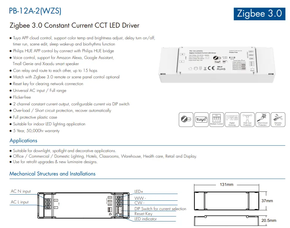 12W gehienezko LED kargarako diseinatuta, Zigbee 3.0 LED Driver-ek segurtasun-babes funtzio osoa eskaintzen du. Irteera egonkorra eta haririk gabeko komunikazio fidagarria aproposa da epe luzerako egonkortasuna duten barruko argiztapen adimendunaren proiektuetarako.