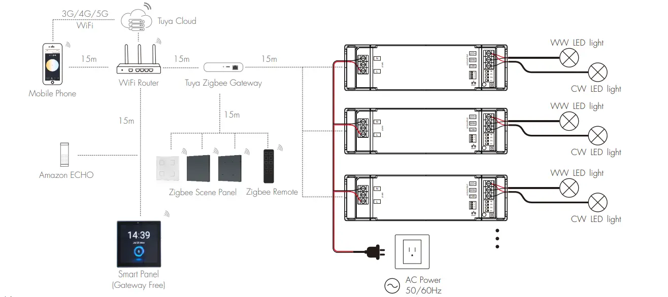 TUYA Zigbee LED Driver-ak TUYA Zigbee protokoloa guztiz onartzen du haririk gabeko konexio egonkorra lortzeko, keinurik gabeko CCT leuna eta distira itzaltzea lortuz. APP kontrola, ahots kontrola, talde kontrola eta eszena modua onartzen ditu, argiztapen sistema adimendunei erosotasun handia eskainiz.
