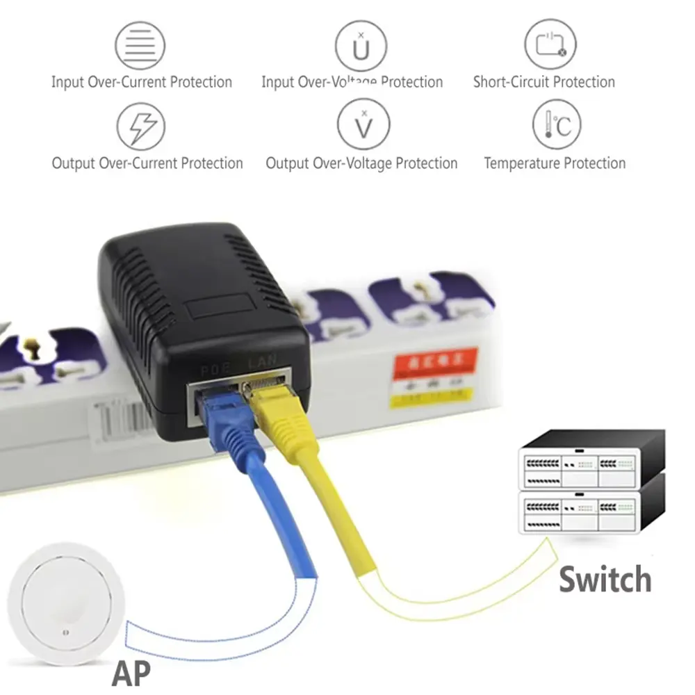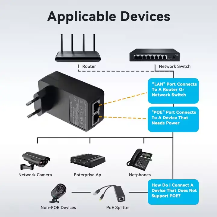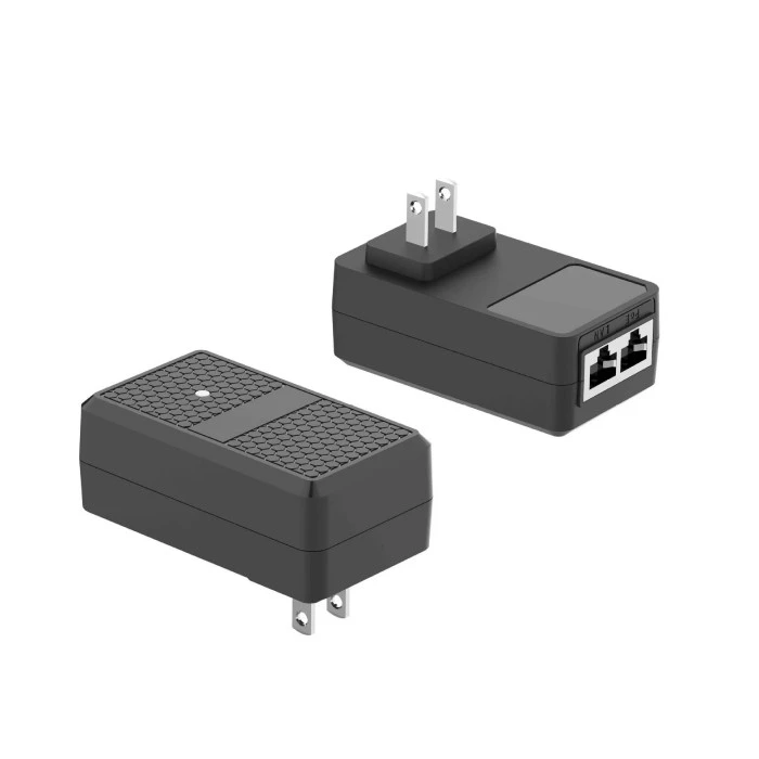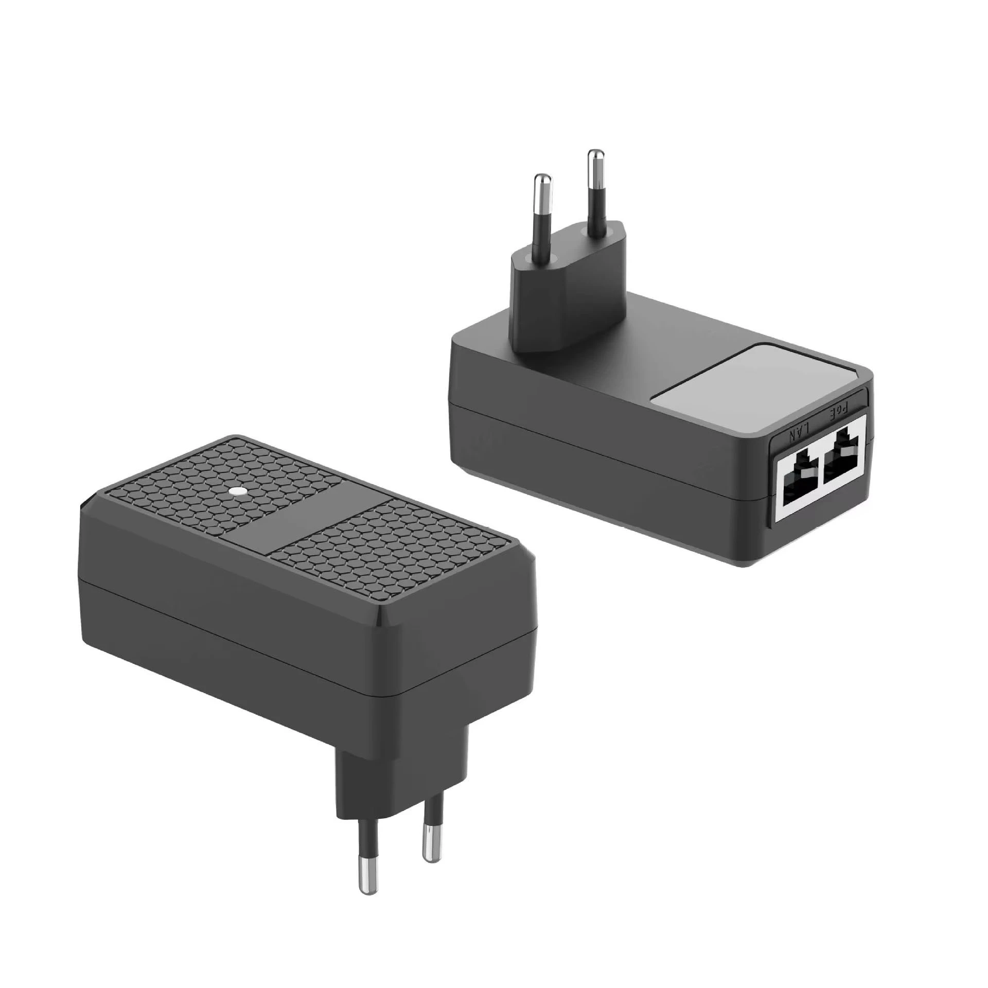 12W-ko hormako entxufe trukagarria PoE injectora sareko elikatze-gailu integratua da, potentzia-moldagailua eta PoE injektore pasiboa unitate trinko bakar batean konbinatzen dituena. PoE konfigurazio tradizionalek elikadura-moldagailua eta injektore-modulu bat behar dituztenak ez bezala, diseinu honek instalazioa errazten du, gailua zuzenean hormako entxufe batean muntatzeko aukera emanez.