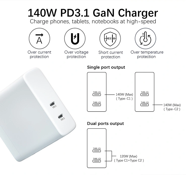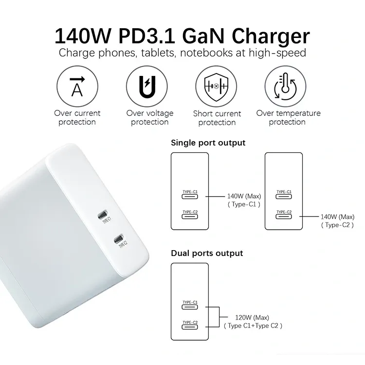 140W biko usb c ataka PD kargagailua AEBetako entxufea tolesgarria: ataka bakarrak 140W-ko potentzia eman dezake. Portu bikoitzeko irteerako potentzia modu adimentsuan esleitzen da aldi berean. Ordenagailu eramangarria eta telefono mugikorra aldi berean kargatzean, eraginkortasuna ez da aldatzen.
