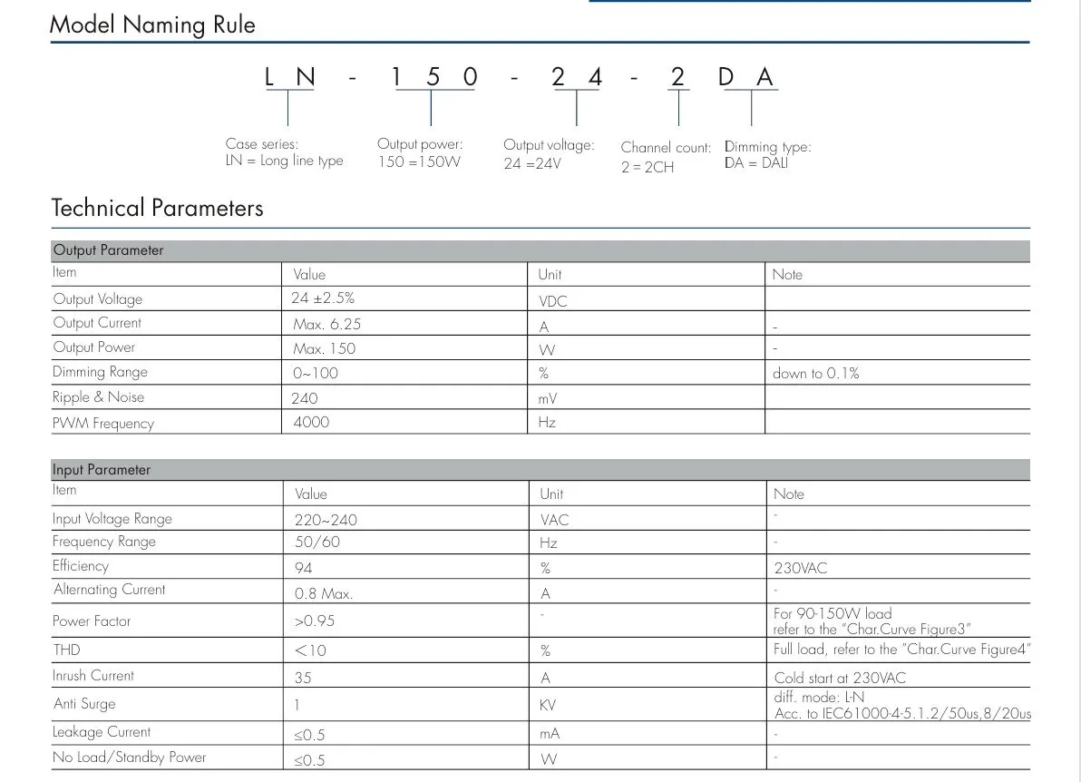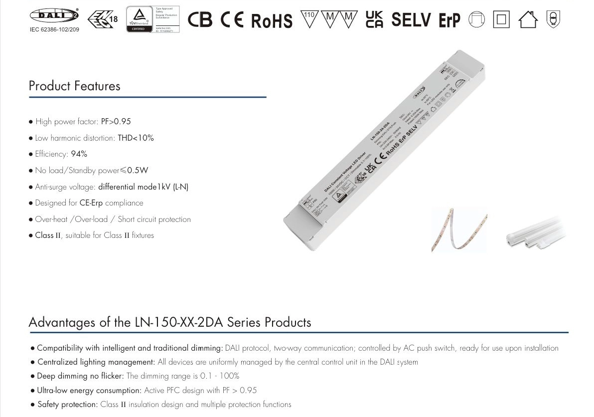 Isolamendu bikoitza: 150W 24V DALI CCT Tentsio Konstanteko LED Driver oinarrizko isolamenduz eta isolamendu osagarriz osatuta dago, isolamendu babesteko bi geruza independente osatuz, geruza batek huts egiten badu ere, beste geruzak deskarga elektrikoa saihes dezake.