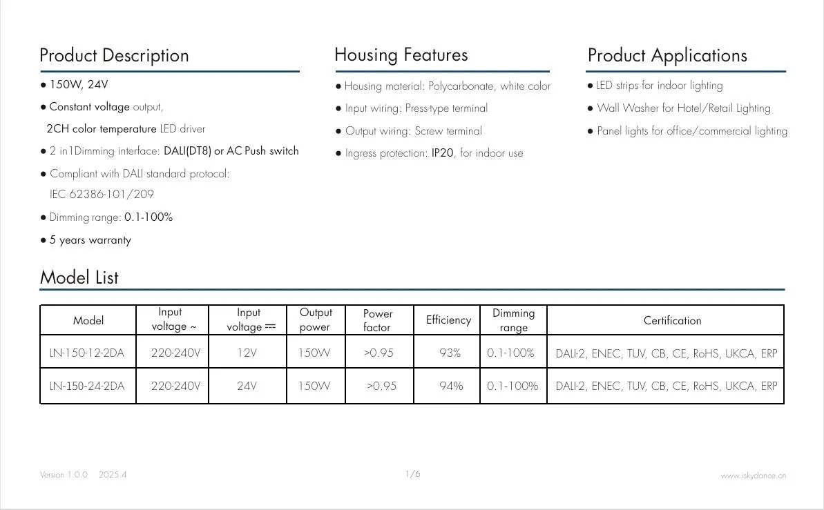 Starwell fabrikaren salmenta beroa 150W 24V DALI CCT Tentsio Konstanteko LED Driver-ek DALI CCT kolore bikoitzeko tenperatura doikuntza independentea onartzen du, distira eta kolore-tenperaturaren kontrol zehatza ahalbidetzen du argiztapen beharrak asetzeko. Produktuak % 91ko eraginkortasun handia, potentzia-faktorea (PF) > 0,95, distortsio harmoniko baxua (THD) <% 10 eta erreserbako energia-kontsumo oso baxua (≤ 0,5 W) ditu, CE-Erp energia-eraginkortasun estandarrak betetzen dituena.