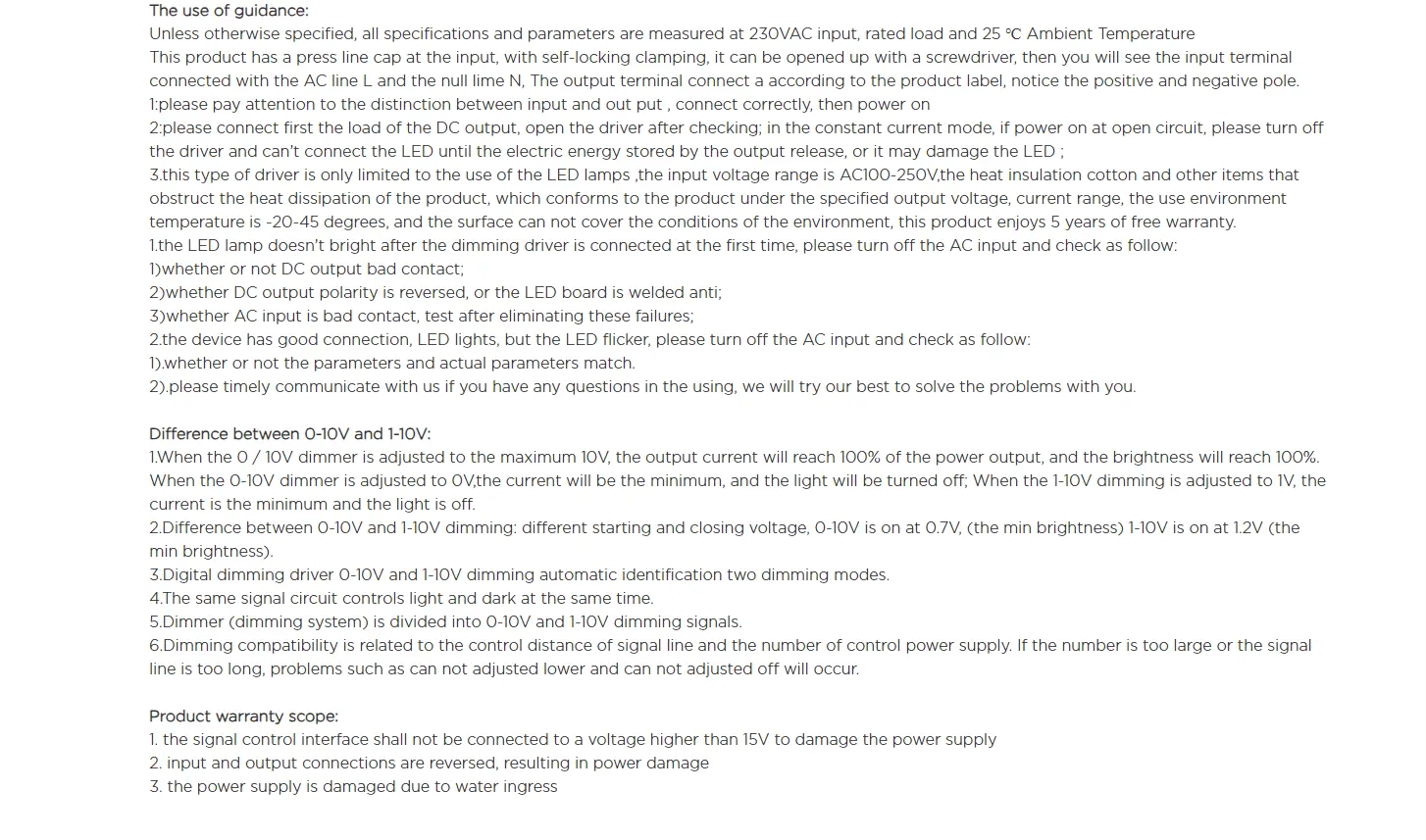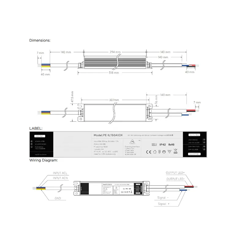 0-10V-ko iluntze-interfaze estandar batez hornituta, %1etik %100era arteko distira doikuntza leuna onartzen du, merkatuko dimmer nagusi gehienekin bateragarria. % 95era arteko energia-eraginkortasun handia eta 100-277 V-ko AC sarrerako sorta zabala dituena, ahaleginik gabe egokitzen da tentsio estandar globaletara, ezin hobea nazioarteko proiektuetarako.