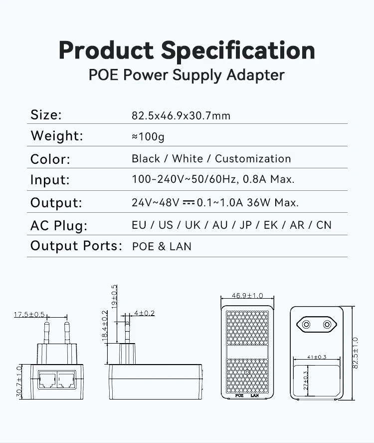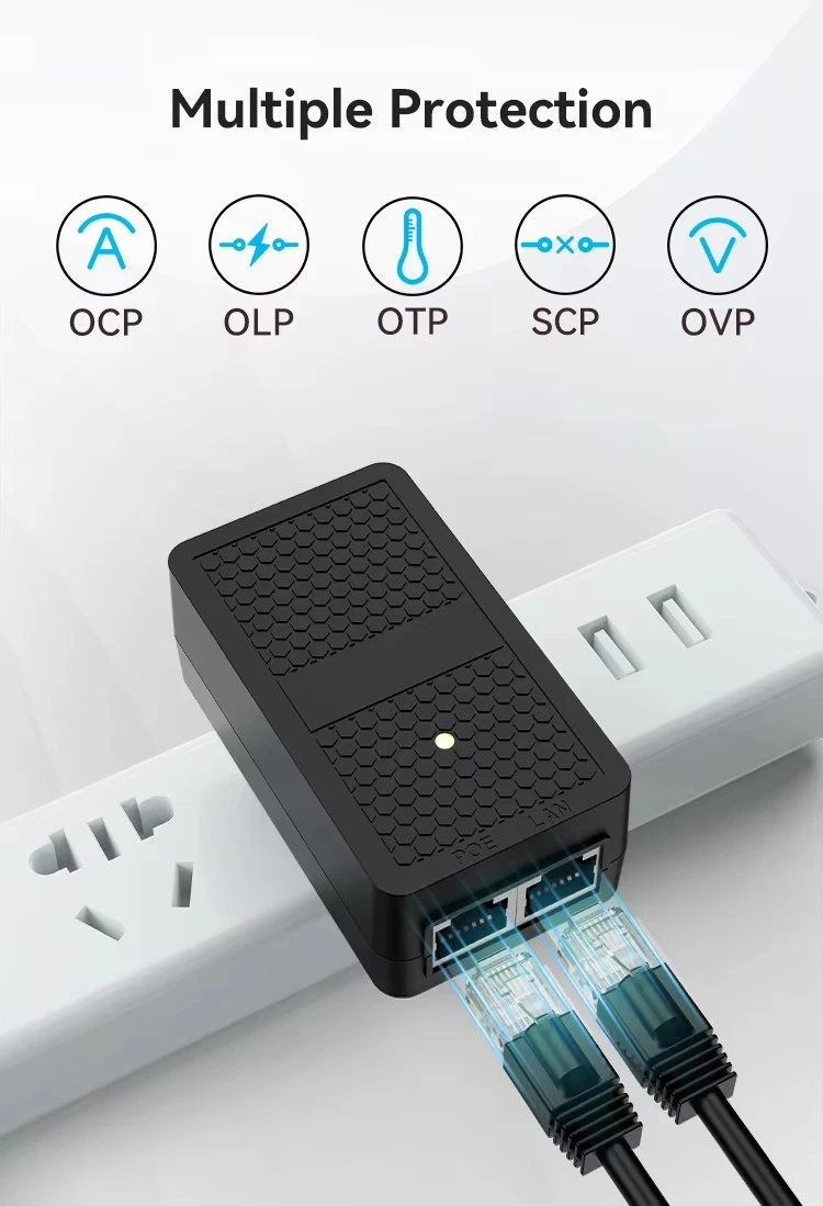 Fidagarritasunerako osagai premiumekin eraikia, injektore honek AEB/CN/EU/Erresuma Batua/AUS merkatuetarako tapoi trukagarriekin dator. Segurtasun-ziurtagiri globalak ditu, besteak beste, UL, CE, FCC, TUV eta UKCA. STARWELL-ek kalitate handiagoa eta prezio lehiakorrak konbinatzen ditu, eta PoE injektore hau aukera ezin hobea da sare-instalazio profesionaletarako potentzia-emate fidagarria eta abiadura handiko datu-transmisioa behar duten horma-forma trinko batean.