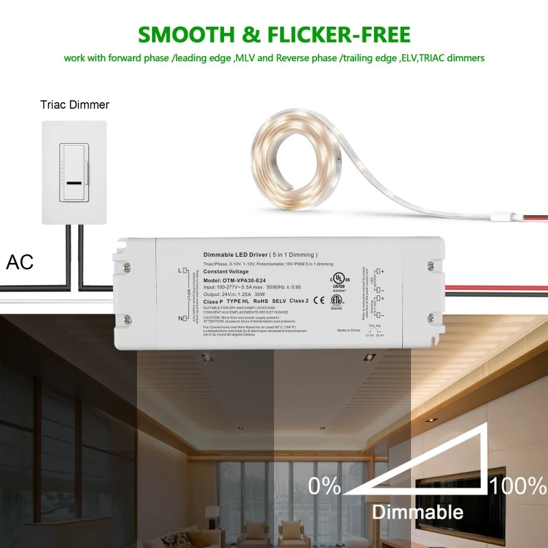 3. Eraginkortasun handia eta energia aurreztea: STARWELL kalitate handiko 30W 24V Triac Dimming Led Driver-ak % 88 arteko bihurtze-eraginkortasuna du eta energia-kontsumo txikia du ≤ 0,5 W-ko potentziarik gabe, eta horrek epe luzerako energia kostuak murrizten laguntzen du.