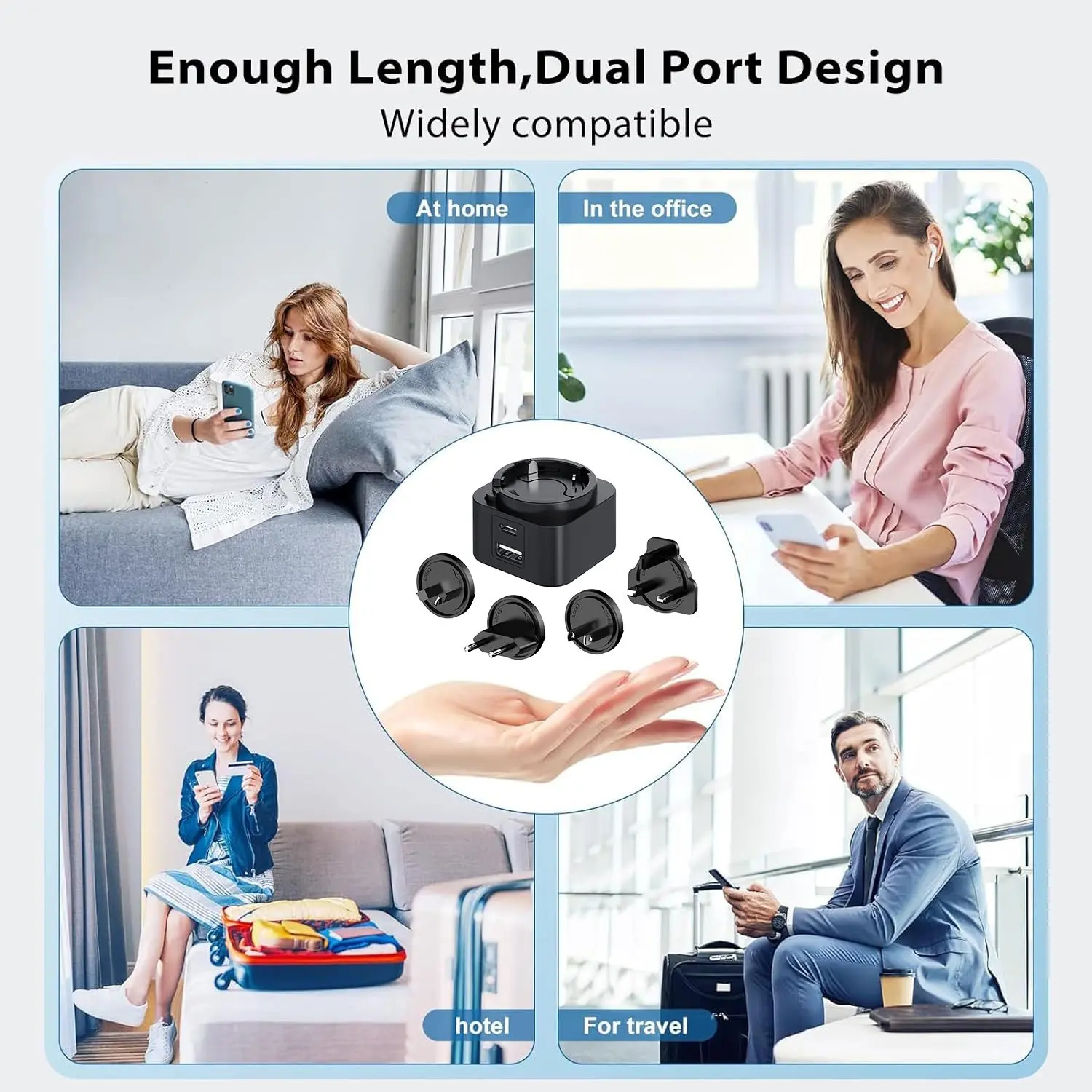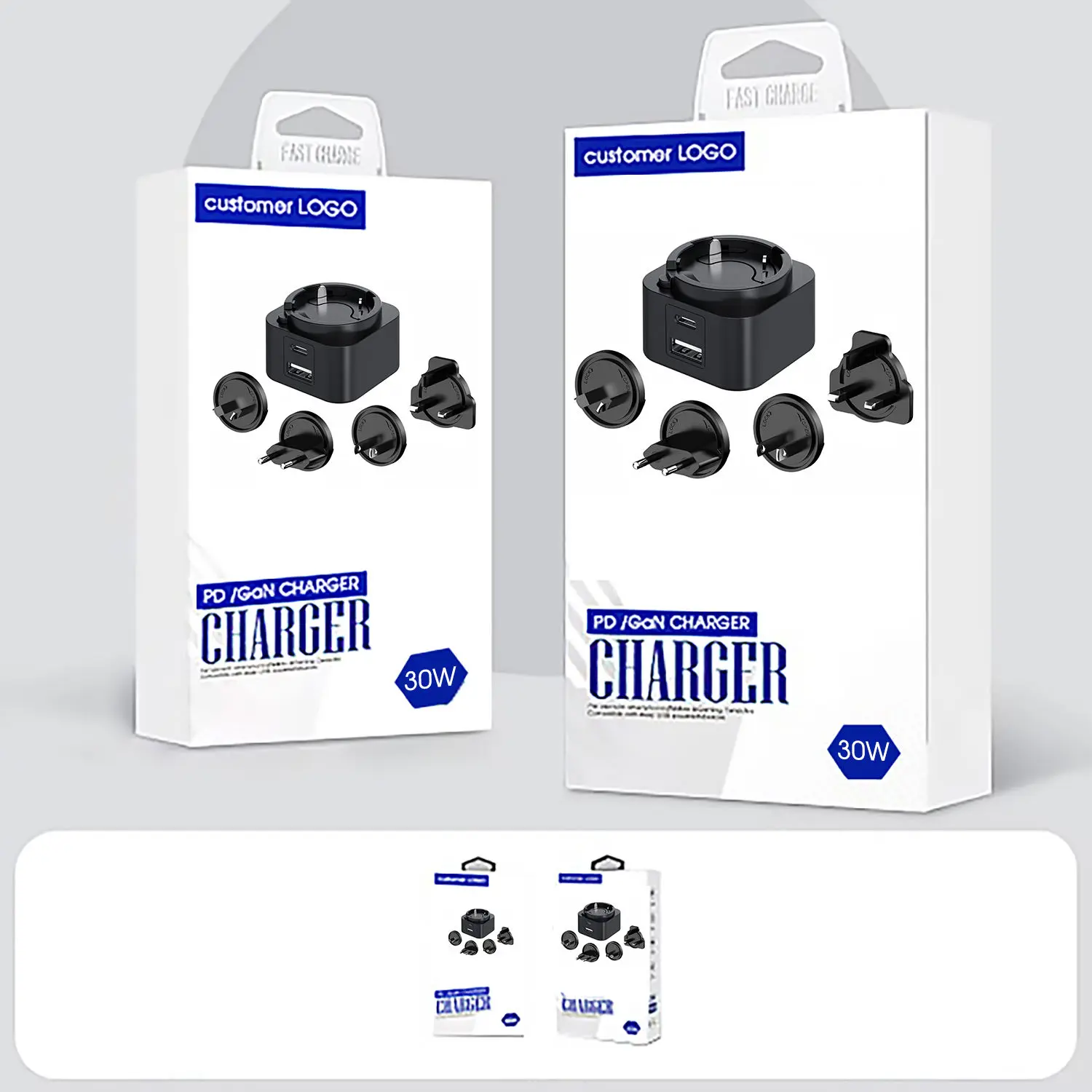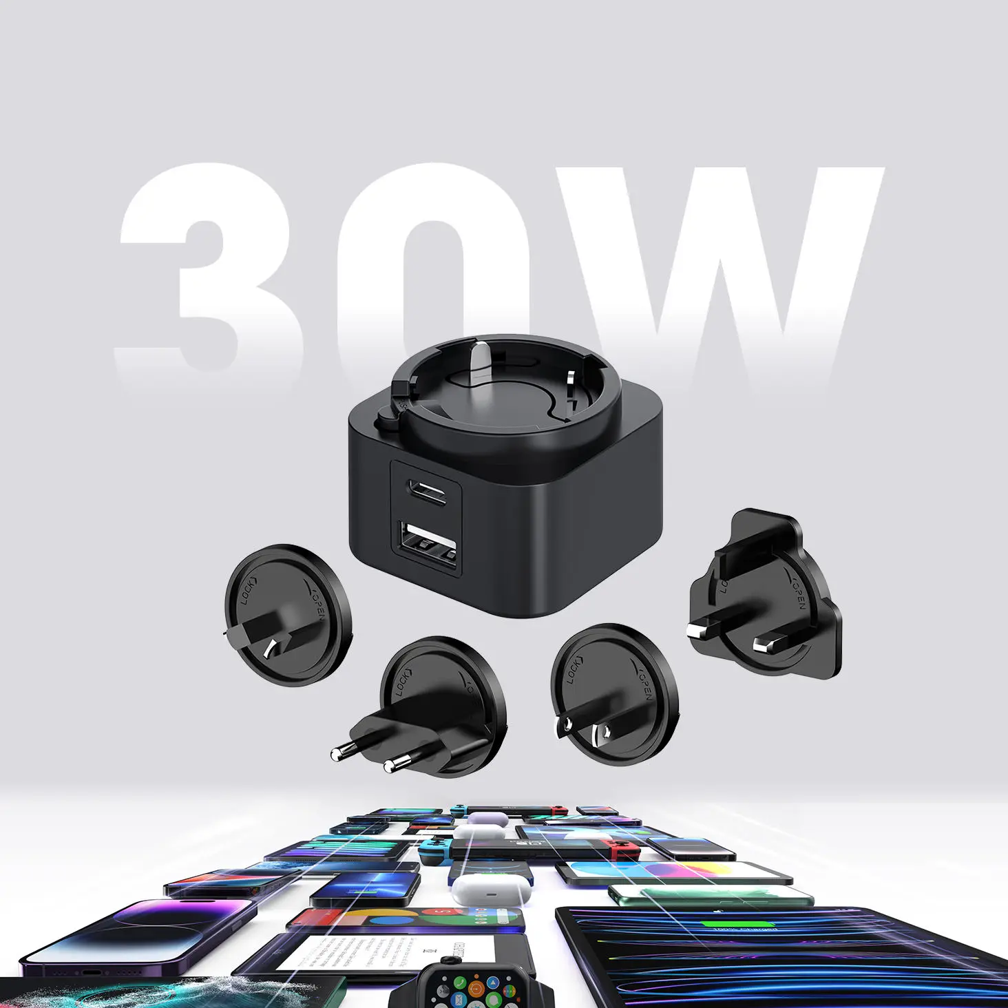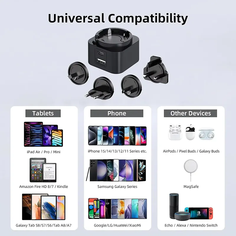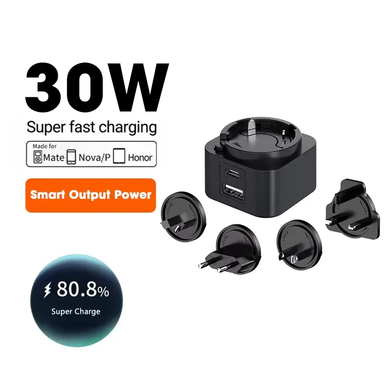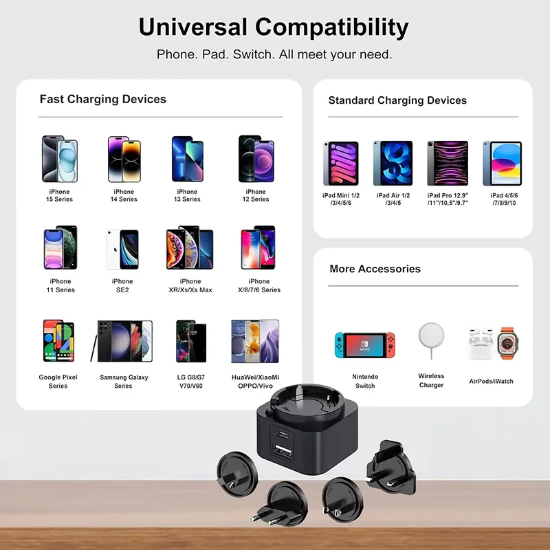 Aniztasuna funtsezkoa da. Ataka bikoitzeko diseinuak (USB-C/USB-A) bi gailu aldi berean kargatzeko aukera ematen du. 30 W-ko entxufe trukagarria PD kargagailuak entxufe trukagarri multzo bat dauka (AEB/EB/Erresuma Batua/AU), mundu osoko bidaia-lagun ezin hobea bihurtuz. Telefonoa, tableta edo ordenagailu eramangarria kargatzen ari zaren ala ez, bateragarritasun unibertsalak maila goreneko errendimendua bermatzen du.