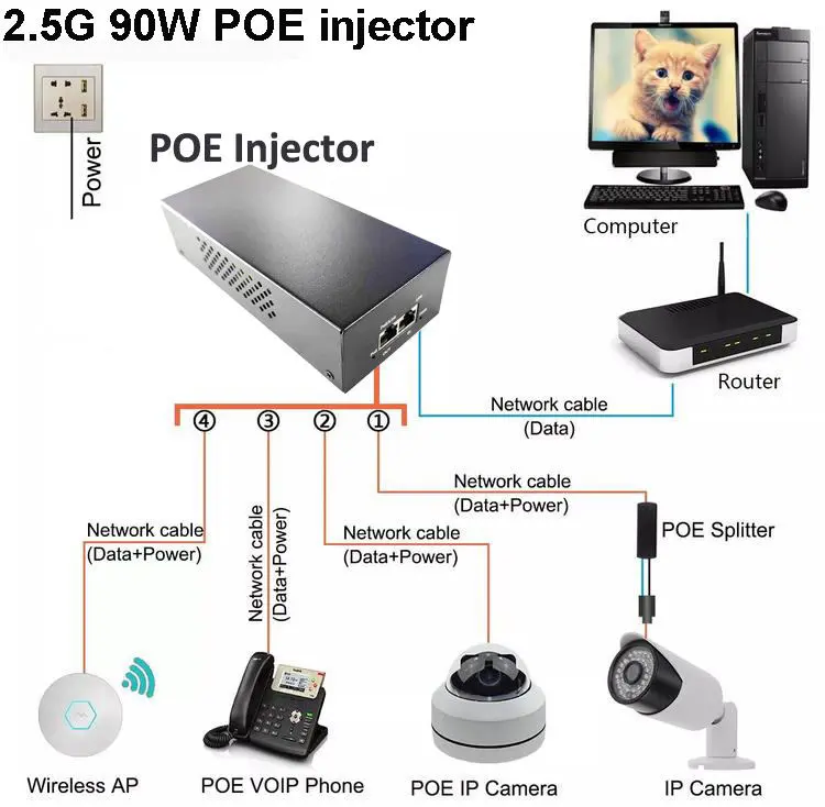 Starwell fabrikako 48V 90W PoE Injector PoE egokitzailea, errendimendu handiko irtenbidea Ethernet bidez energia fidagarrian eta datuak emateko diseinatua. IEEE802.3af/at/bt PoE++ estandarrak guztiz betetzen ditu, injektore honek 2.5G abiadura handiko datu-transmisio egonkorra bermatzen du eta eskari handiko gailuak elika ditzake, hala nola IP kamerak, haririk gabeko APak, sareko etengailuak eta IP terminalak. Bere diseinu trinkoak, plug-and-play, etxeko, bulegoko eta industria sareetan instalazioa errazten du, PoE elikadura-hornidura segurua eta eraginkorra eskaintzen du konfigurazio minimoarekin.