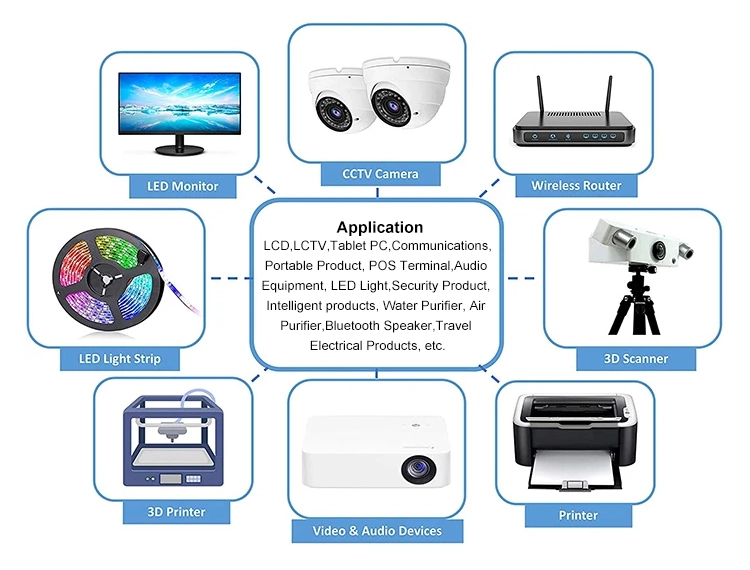 * 48W serierako unitate gehiago: 5V/9V/12V/15V/19V/24V/36V/48V eskuragarri * Segurtasuna: OCP/OVP/OTP, SCP, gainkargaren mozketa automatikoa, tentsioaren gaindiko mozketa, mozketa termiko automatikoa. * Bateragarritasun zabalak: LED tira argiak, 3D inprimagailua, urdaiazpiko irrati-transceptor, CCTV kamerak, autoaren subwoofer anplifikadorea, audio anplifikadorea, haririk gabeko bideratzailea, ADSL katuak, hezegailua, HUB, teklatua, BT bozgorailua, monitorea, webkamera, DVR, NVR, audio/bideo hornidura.