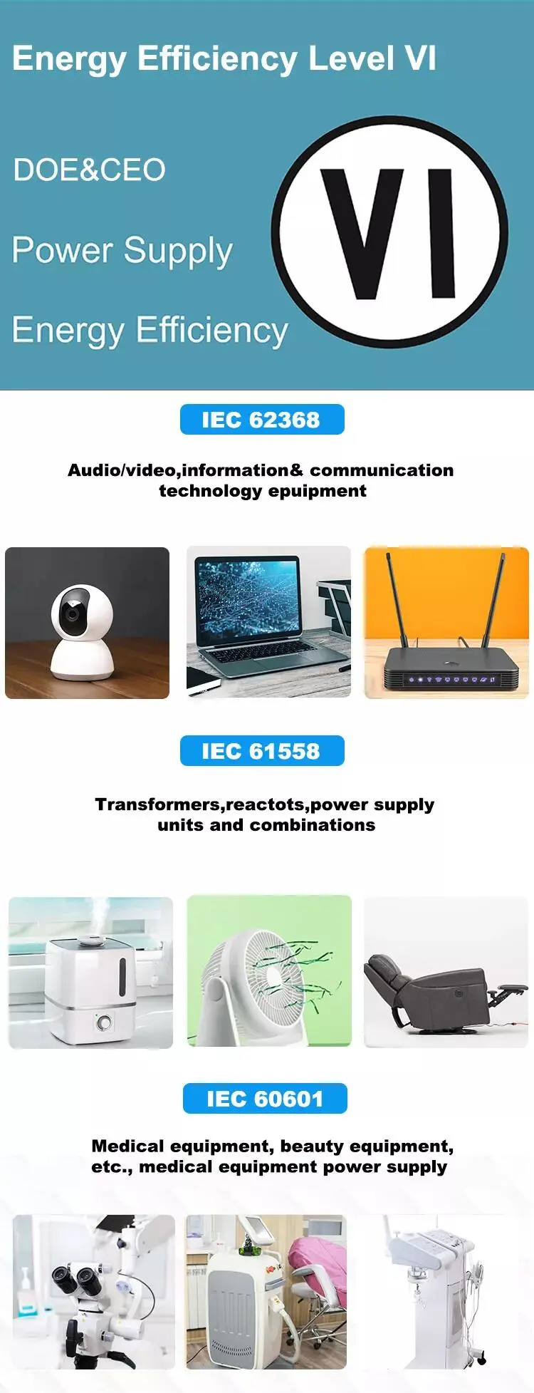 IEC62368 Kontsumoko elektronikarako, IEC60335 bateria kargagailurako, IEC60601 mediku mailako ekipoetarako, IEC61558 etxeko aplikaziorako, IEC61347 led argietarako. |