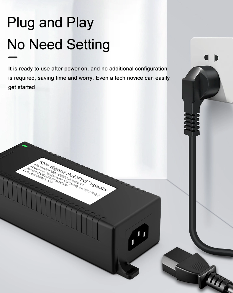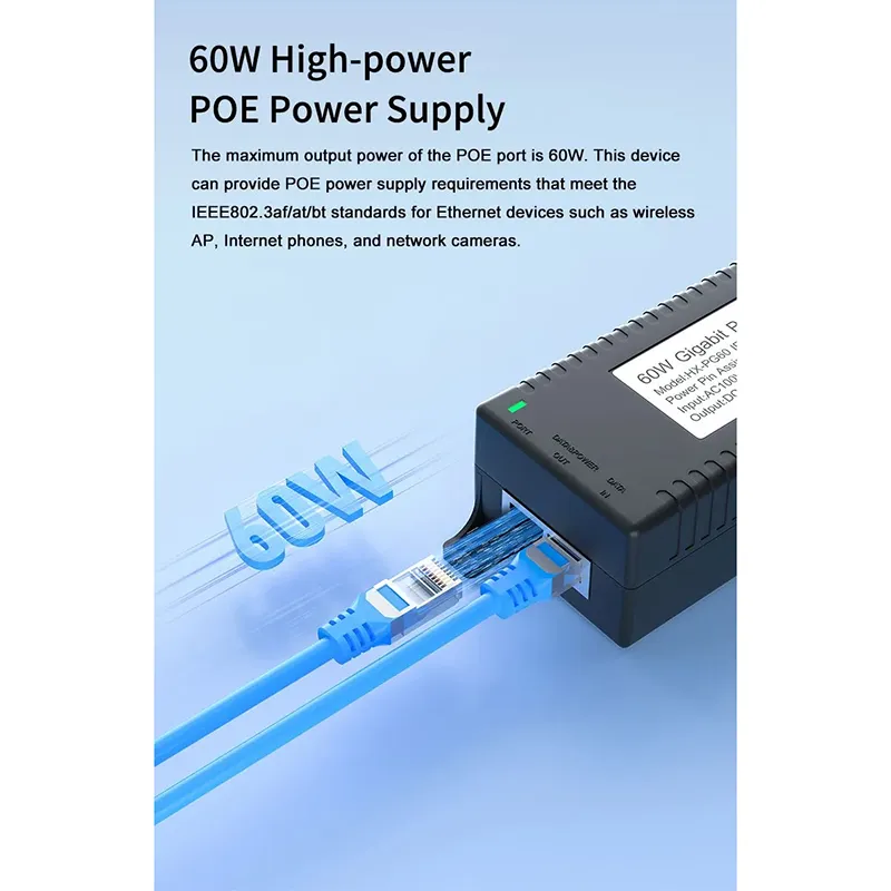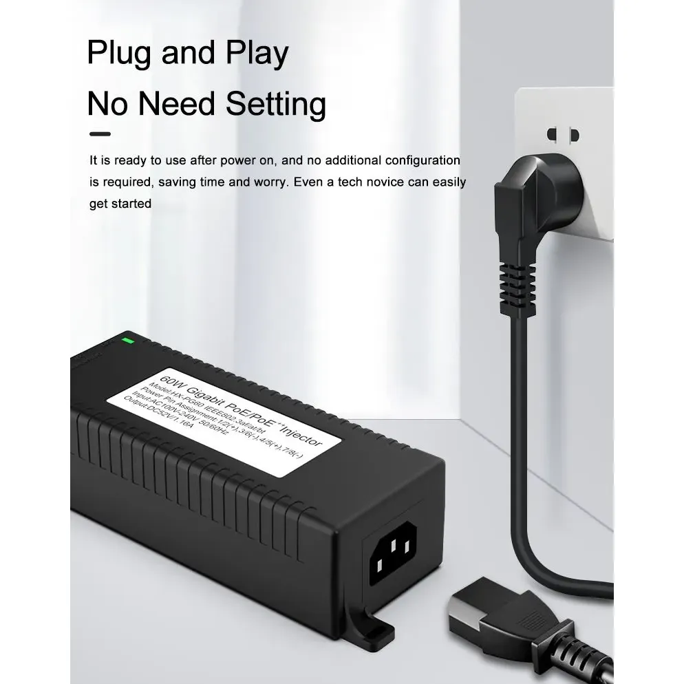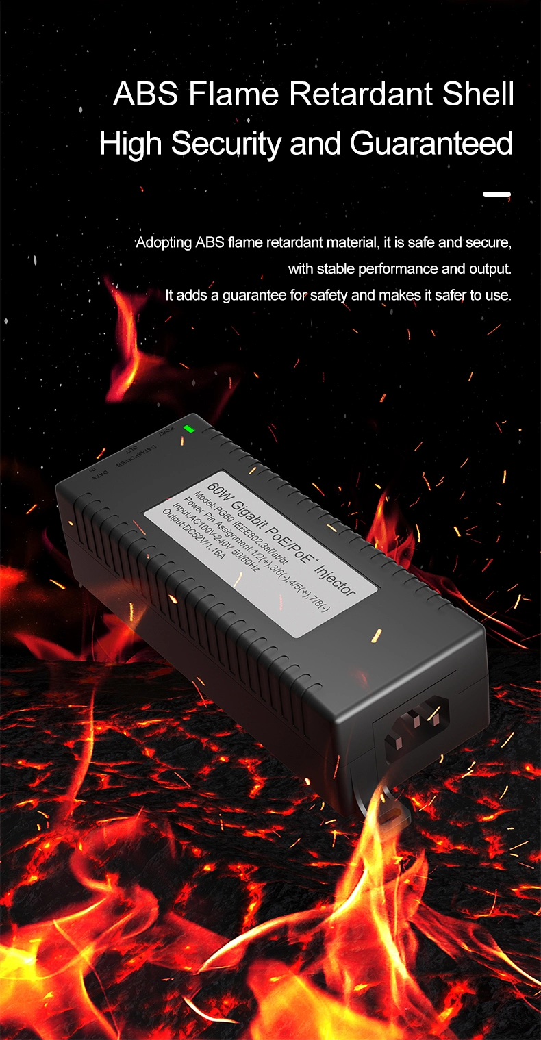 Segurtasun-zaintza: Gigabit 60W mahaigaineko POE injektoreak IP Kameraren Segurtasunerako eta Sare Gailurako potentzia egonkorra eskaintzen die IP kamerei eta PTZ kamerei.