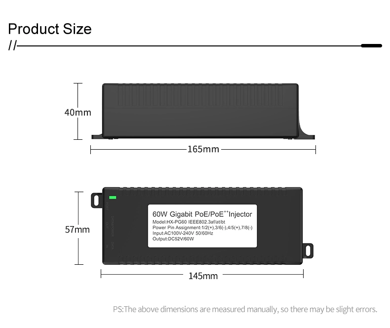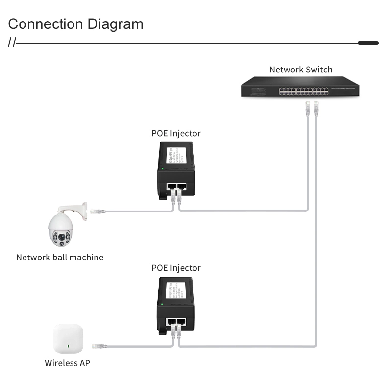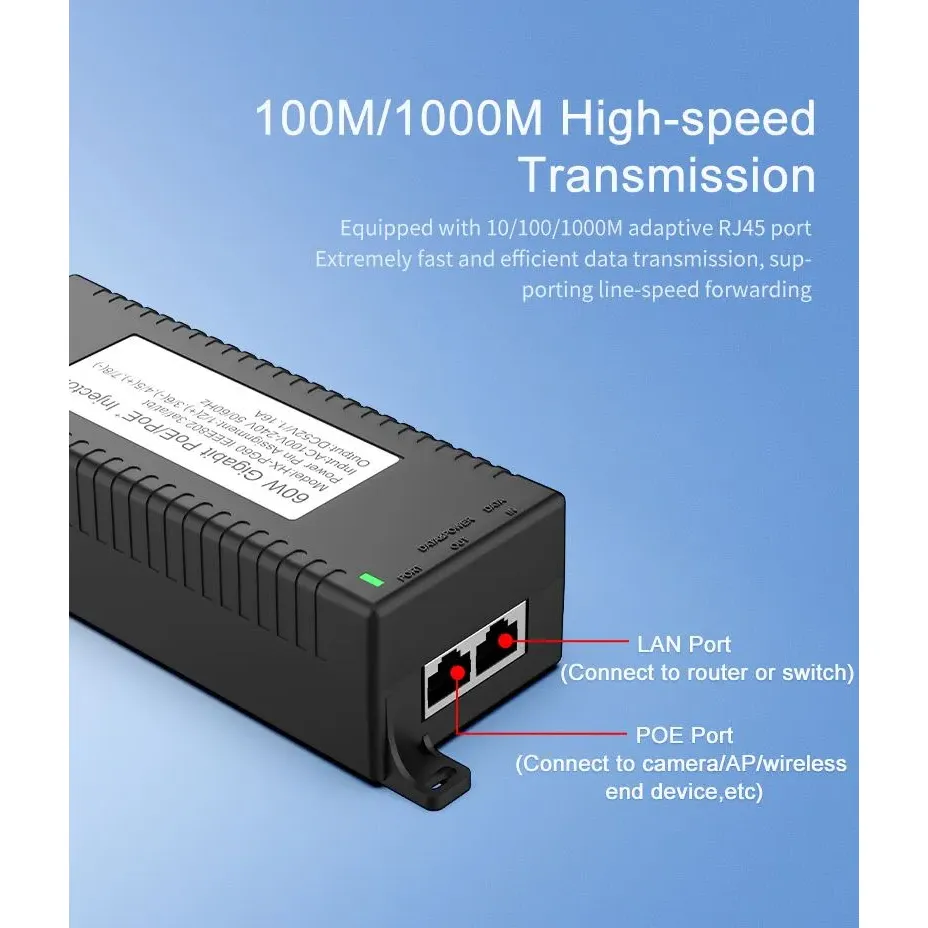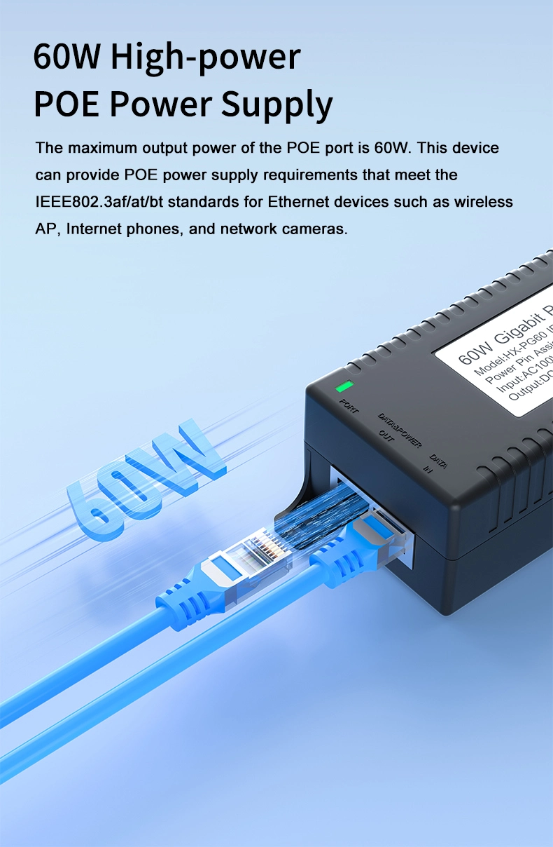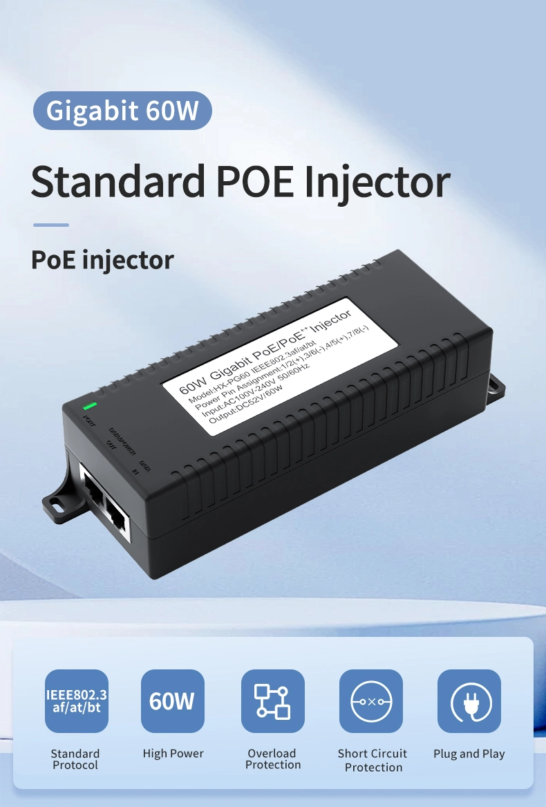 Segurtasun-zaintza: Gigabit 60W mahaigaineko POE injektoreak IP Kameraren Segurtasunerako eta Sare Gailurako potentzia egonkorra eskaintzen die IP kamerei eta PTZ kamerei.