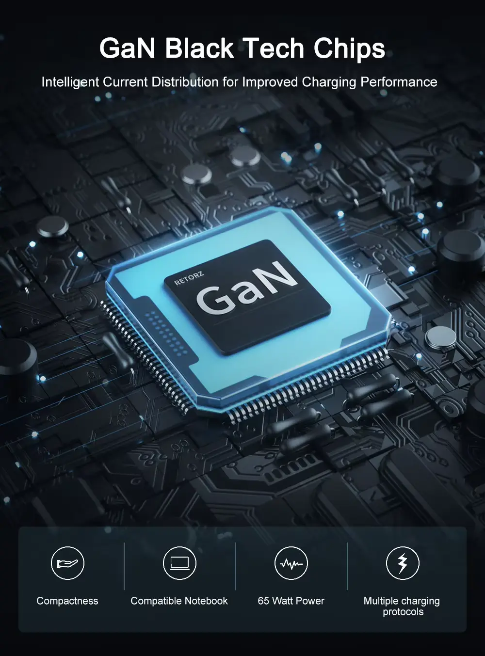 Abiadura handiko 65 W kargatzea: ordenagailu eramangarriak eta karga bizkorreko telefonoak elikatzen ditu.