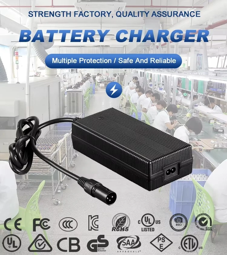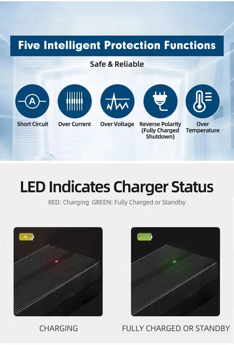 Bateragarritasun globala eta segurtasun sendoa: 100-240 VAC sarrera unibertsala du, mundu osoan zehar ezin hobeto funtzionatzen du. Hiru faseko karga adimendun aurreratuak (CC/CV) bateriaren osasuna optimizatzen du, eta babes integralek (zirkuitu laburrak, gain-tentsioa, gain-tenperatura eta gainkarga barne) funtzionamendu segurua eta kezkarik gabekoa bermatzen dute. Etxebizitza iraunkorra suaren aurkako materialekin eraikita dago, ingurune zorrotzetan fidagarritasuna hobetzeko.
