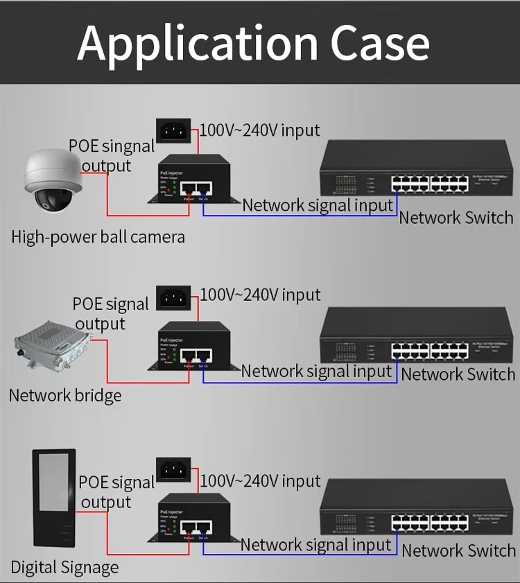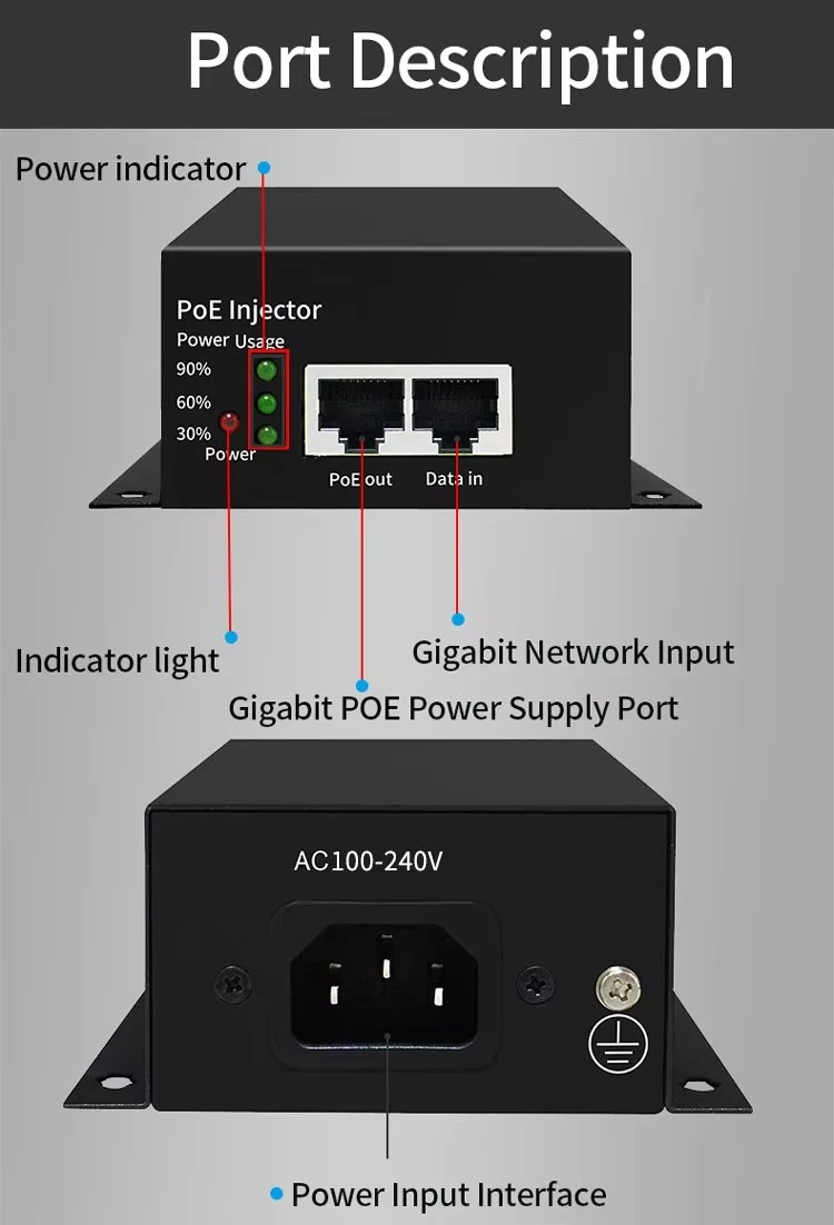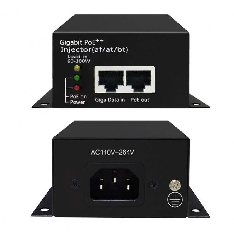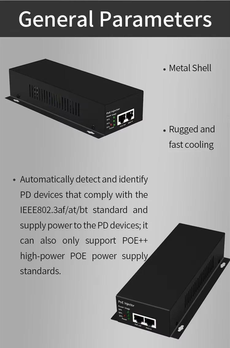 Kalitate handiko 60W POE injektore aktiboa Txinako Starwell fabrikatzaileak eskaintzen du. 10/100/1000Mbps datu-sarrerako ataka bat eta PoE (Datuak+Power) irteerako ataka ditu. 802.3bt-ren polaritate-eskakizun alternatiboak guztiz onartzen ditu, lau bikoteak (1/2+, 3/6- & 4/5+, 7/8-) aldibereko datu-transmisiorako eta 48V DC-ko elikadurarako.