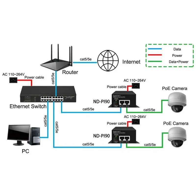 Aldakortasunerako diseinatua, injektore hau atzerako bateragarria da 802.3af/at gailuekin. Ezin hobea da PTZ kamerak, errendimendu handiko haririk gabeko sarbide puntuak eta bideokonferentzia ekipoak elikatzeko. Produktuak plug-and-play irtenbide sinple bat eskaintzen du, entxufe elektriko osagarrien beharra ezabatuz eta instalazioen konplexutasuna murrizten du enpresa eta industria aplikazioetan.