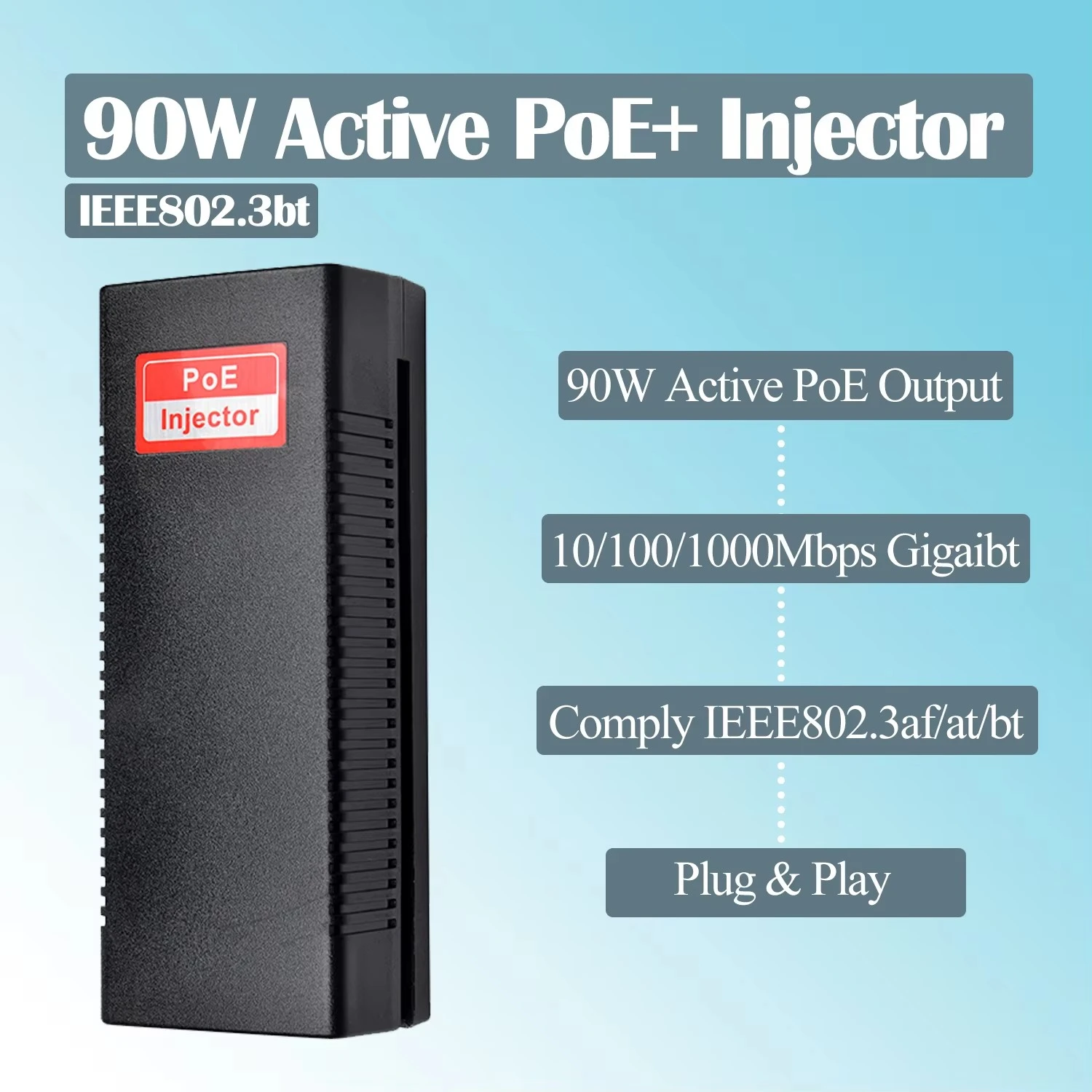 Txinan elikatze horniduraren fabrikatzaile profesional gisa, Starwell-ek 90W PoE injektore aktiboa aurkezten du, modu aktibo eta pasiboa onartzen duena. Potentzia detektatzeko zirkuitu adimentsuaz hornituta, konektatutako gailuen potentzia-eskakizunak automatikoki identifikatzen ditu eta horren arabera doitzen du bere irteera; Gainera, integratutako hutsegite-mekanismoak estandarrak ez diren terminalen segurtasuna bermatzen du.