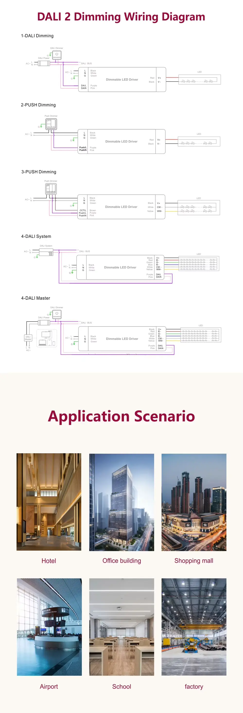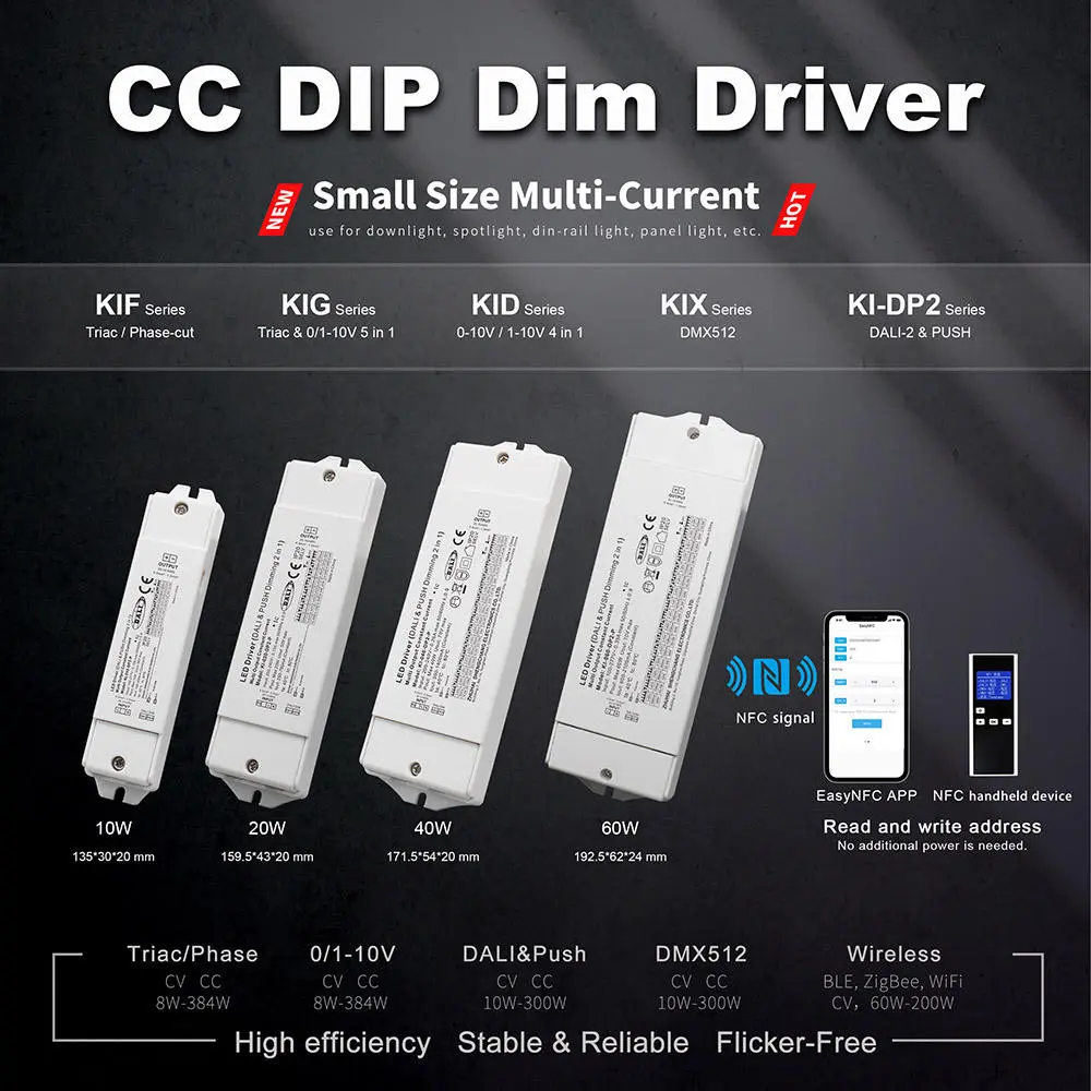 Fidagarritasuna eta errendimendua lortzeko diseinatuta, korronte irteera egonkorra bermatzen du LED funtzionamendu koherenterako. Bere 2-in-1 diseinuak inbentarioa arintzen du eta proiektuen beharretara egokitzen da, eraikin adimendun automatizatuetatik hasi eta berritze aplikazio sinpleagoetara.