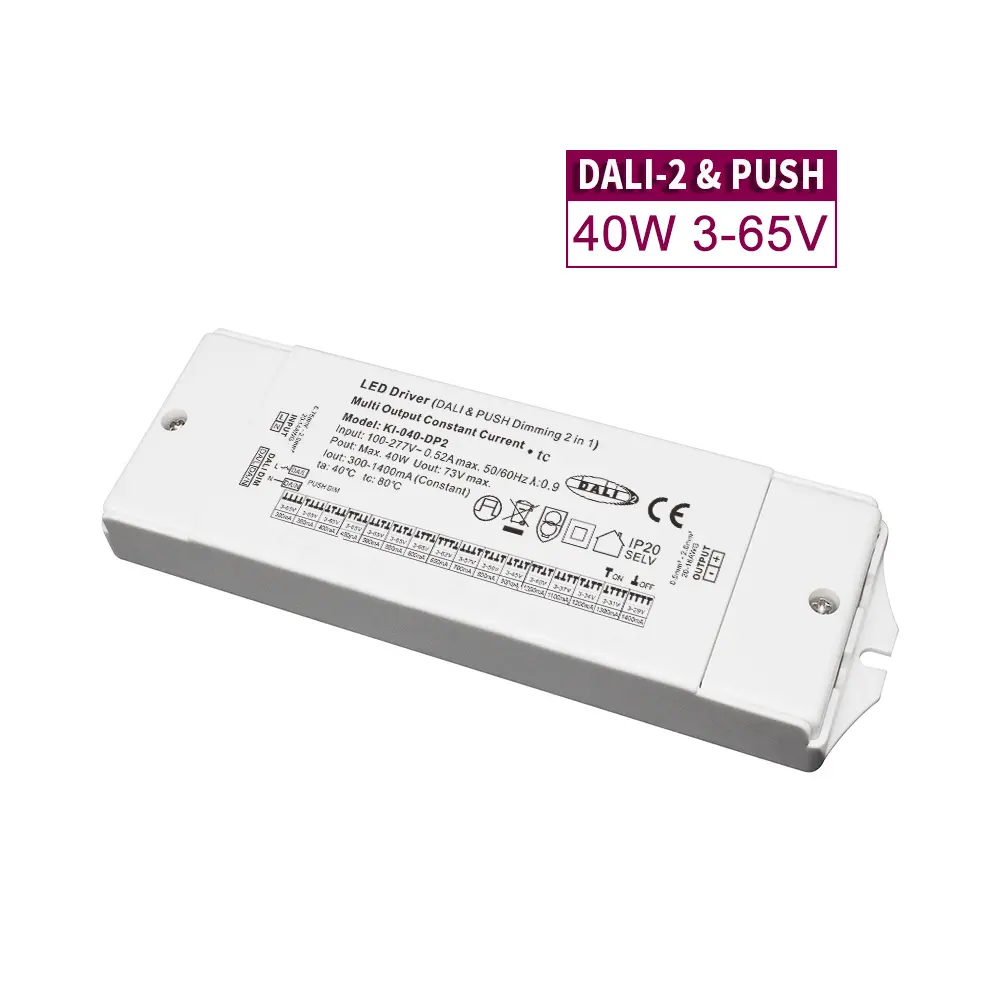 DALI Constant Current CCT Dimming Led Driver goi-mailako arkitektura, merkataritza eta ostalaritza proiektuetarako egokia da, argiaren kolorearen tenperatura eta intentsitatea doikuntza zehatza ahalbidetzen du gidari bakar batetik. DALI-2 DT8-k etorkizuneko kontrol interoperagarria bermatzen du eszena sofistikatuetarako eta energiaren kudeaketarako, eta eskuzko Push Dimming aukerak, berriz, kontrol sistema dedikatu bat behar ez den konfigurazioak errazten ditu.