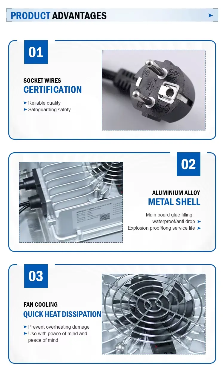 Eraginkortasun handiko eta babes adimenduna: %93ko eraginkortasuna eta ≥0,98 potentzia-faktorea lortuz, kargagailu honek energia-galera gutxitzen du eta funtzionamendu-kostuak murrizten ditu. Eraikitako babesek gaintentsioa, zirkuitulaburra, alderantzizko polaritatea eta tenperatura gehiegizko babesak dira. LED adierazle batek karga-egoera argia ematen du begirada batean.