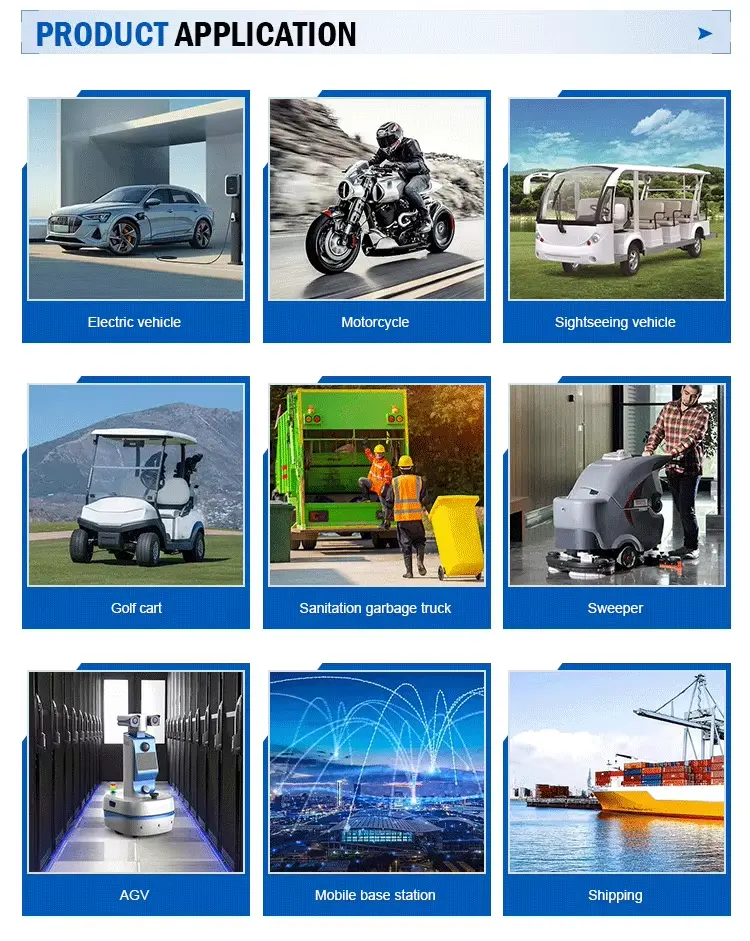 Erabilera: Motozikleta / Scooter, Trizikloa, Mozketa, Garbiketa, Orga jasotzailea, Kamioia, Autobus elektrikoa, Berun-azidozko bateria, Ibilgailu elektrikoa, Ibilgailu turistikoa, Logistika ibilgailua, Garbiketa ibilgailua, Patruila autoa, Dune buggies, Itsasontzia, Komunikazio ekipamendua
