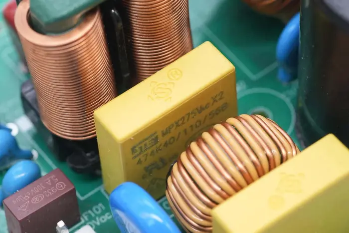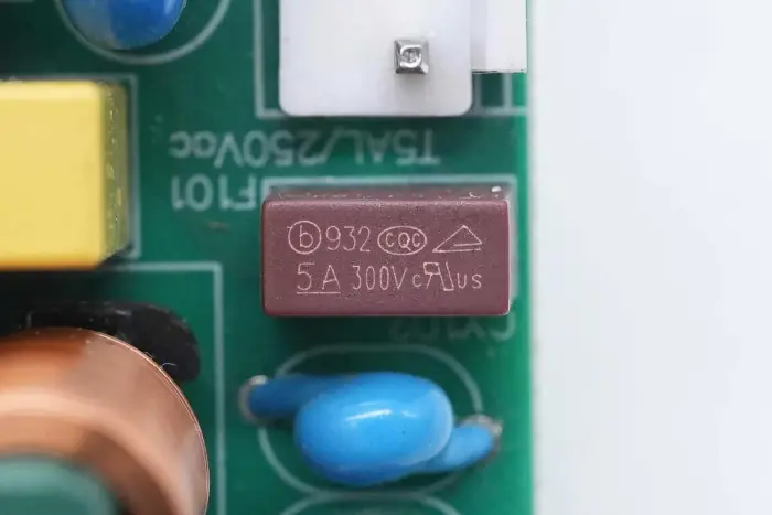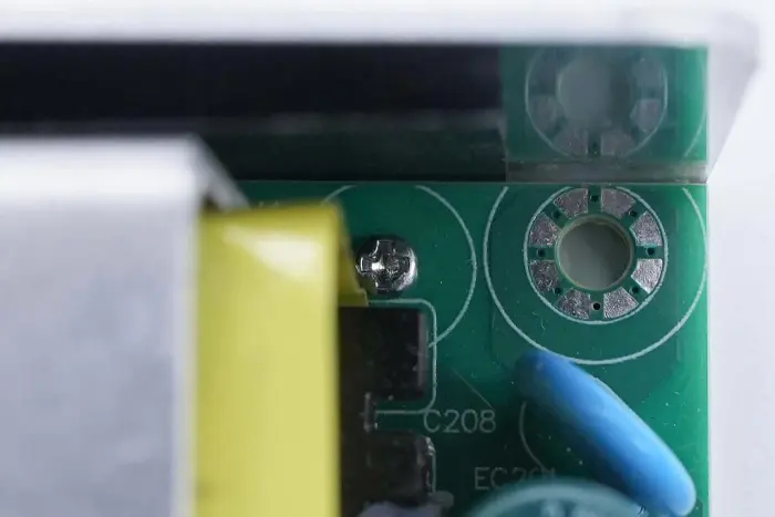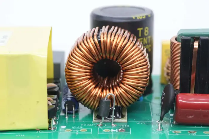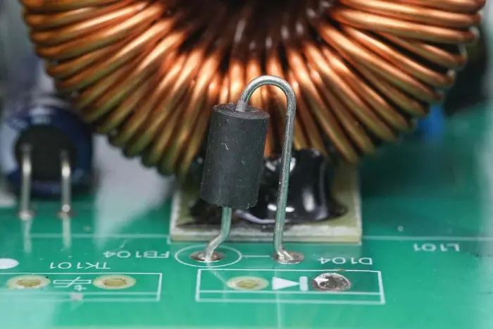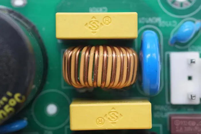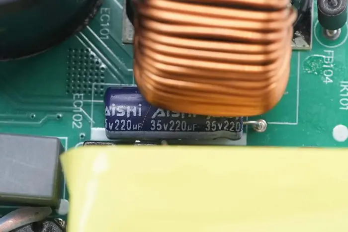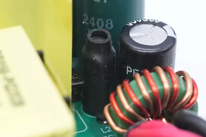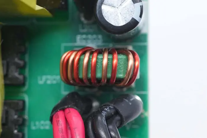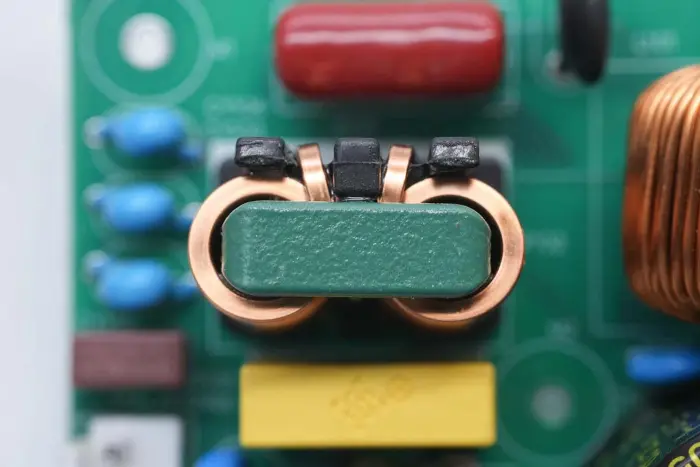 PFC boost induktorea eraztun magnetiko batekin inguratuta dago eta behealdean bakelita xafla bat eskaintzen da isolatzeko.