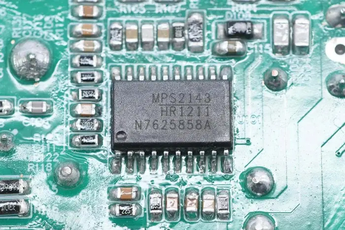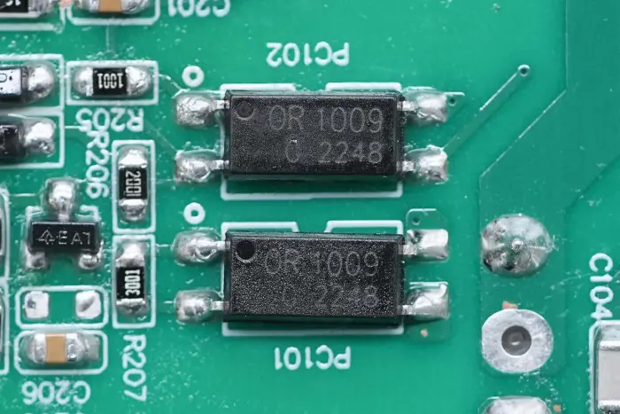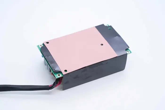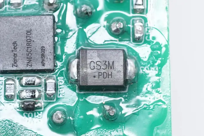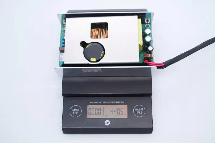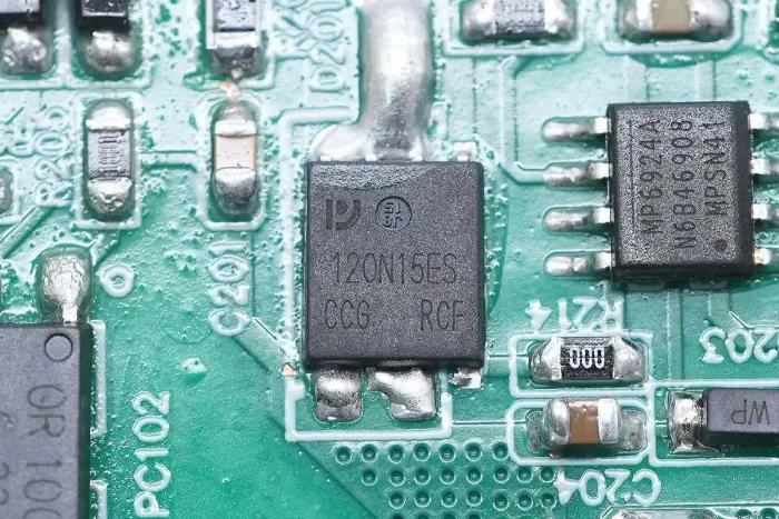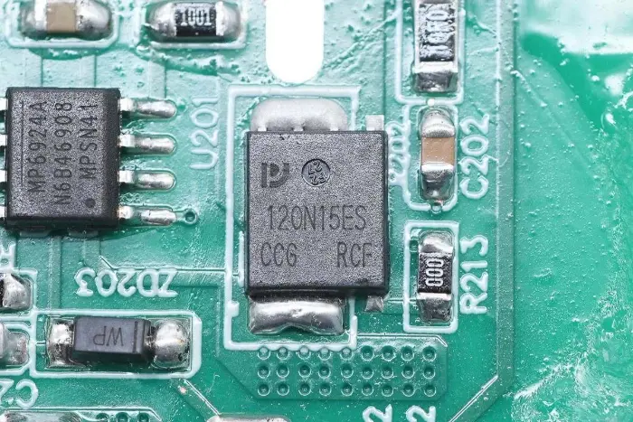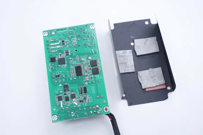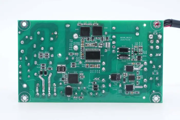 PCBA moduluaren atzealdean, 2-in-1 PFC+LLC kontroladore bat dago. PFC etengailua beheko ezkerrean dago, LLC etengailua kontrol txip nagusiaren gainean dago, feedback optoakoplagailua eskuinaldean eta sinkrono zuzentzaile kontroladore eta bi sinkrono zuzentzaile behealdean daude. Taula osoa babesteko estaldura konformatuz estalita dago.