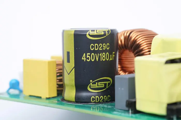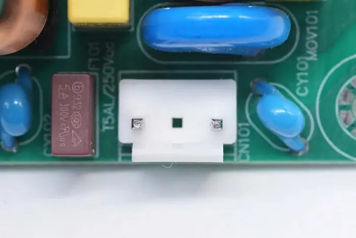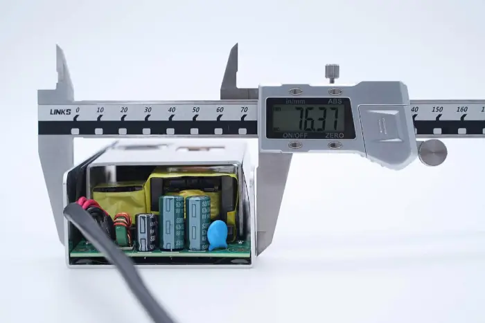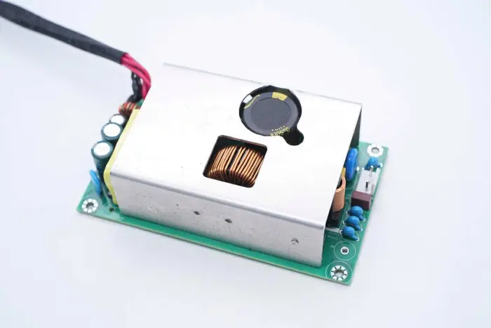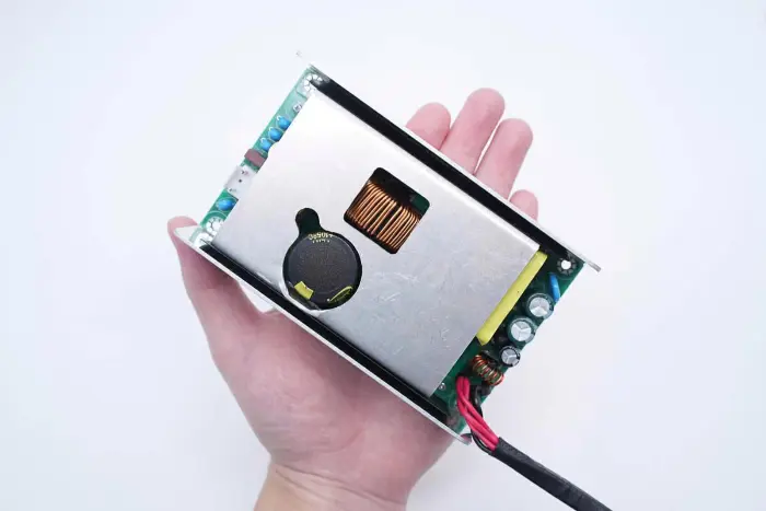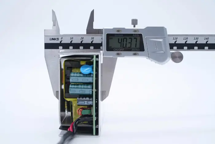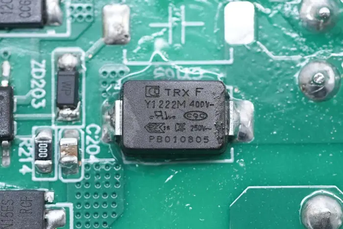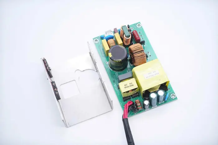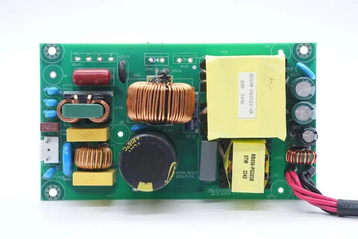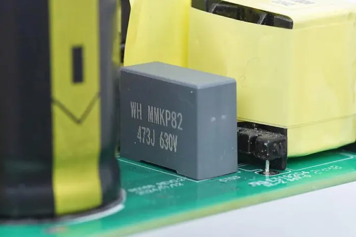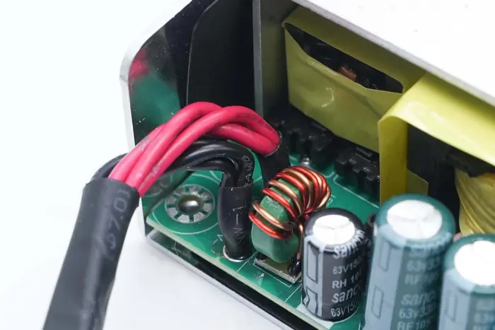 PCBA moduluaren aurrealdearen ikuspegi orokorra: ezkerreko aldea potentzia-sarrerako entxufea, fusiblea, Y kondentsadorea, varistorea, modu komuneko induktorea eta segurtasun X2 kondentsadorea ditu. Erdiko posizioa PFC boost induktore eta goi-tentsioko iragazki kondentsadore batekin hornituta dago. Eskuineko aldea LLC oihartzun-kondentsadorea, erresonantzia-induktorea, transformatzailea, iragazkia-kondentsadorea eta iragazki-induktorea ditu.