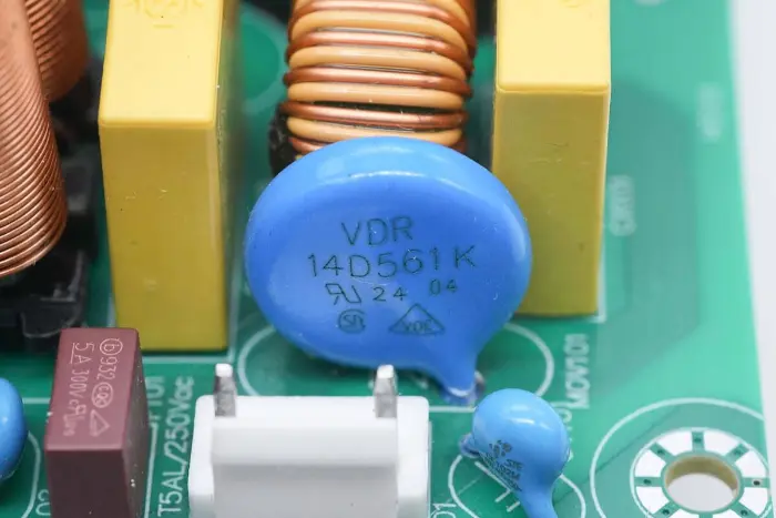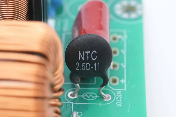 NTC termistorea 2.5D-11 markatuta dago, tentsio handiko kondentsadore elektrolitikoaren karga-korrontea kentzeko erabiltzen dena.