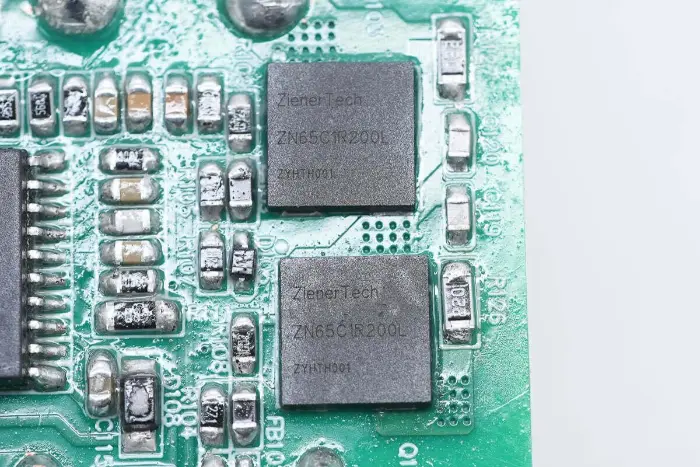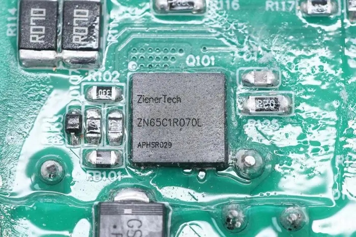 GaN elikadura-hornidura-modulu honek Mornsun Semiconductor kontrol-soluzioa hartzen du, HR1211 2-in-1 kontrolagailu MP6924A sinkrono zuzentzaile kontrolagailuarekin. PFC etengailuak ZenerTech ZN65C1R070L GaN etengailua hartzen du, PFC zuzentzailearen diodoak Sanken SDS065J008N3 SiC diodoa hartzen du eta LLC etengailuak ZN65C1R200L GaN etengailua hartzen du. Hirugarren belaunaldiko erdieroaleak potentzia bihurtzeko eraginkortasuna hobetzeko, potentzia galera eta beroa xahutzeko baldintzak murrizteko erabiltzen dira.