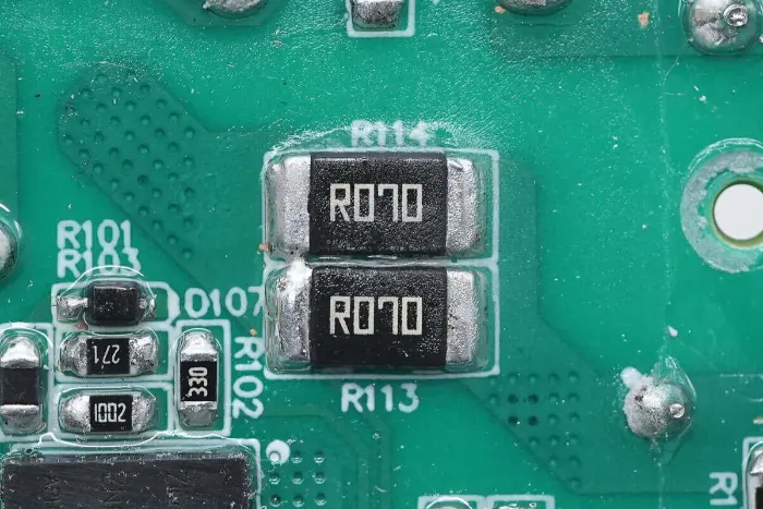 70 mΩ-ko bi erresistentzia paraleloan konektatzen dira etengailuaren korrontea detektatzeko.
