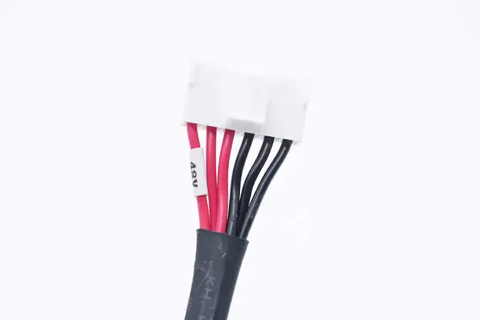 Irteerako konektorearen lehen planoa: kable gorria polo positiboa da eta mahuka 48V-ko irteerarako markatuta dago.