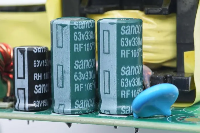 Irteerako iragazkien kondentsadoreak Sancon (Nantong Sanxin) dira, RF serieko bizitza luzeko kondentsadoreak, 63V 330μF-ko zehaztapenarekin, bi paraleloan.