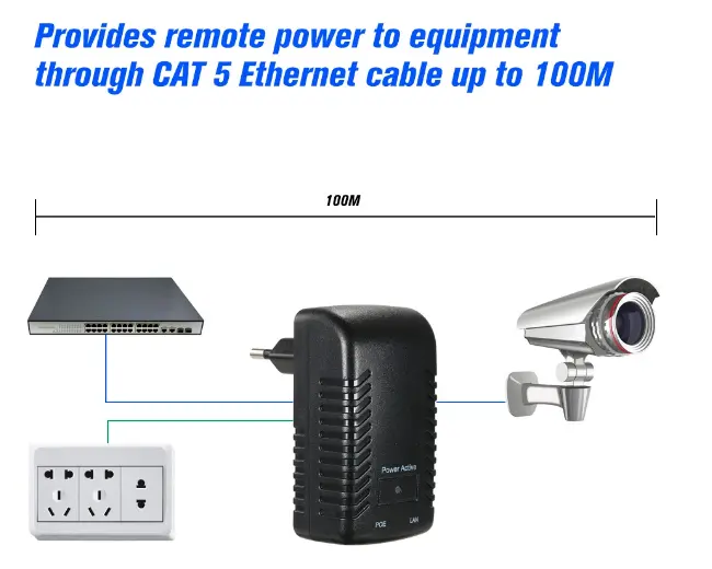 48V IEEE 802.3af estandarrarekin diseinatuta, ez-estandarra horman muntatutako Ethernet egokigailu honek 15W-ko potentzia-irteera egonkorra eskaintzen du, POE-ko IP kamera gehienei guztiz onartzen dutenak, normalean 15-25W behar dituztenak (potentzia handiko PTZ modeloak izan ezik). Halaber, modu fidagarrian funtzionatzen du IP telefonoekin eta 802.3af edo 802.3at POE estandarrekin bat datozen beste gailu batzuekin, zaintza konfigurazioetatik haratago bateragarritasun zabala eskainiz. Epe luzerako funtzionamendu egonkorra izateko eraikia, Wall Plug POE Injector-ak potentzia eta datu-transmisioa Ethernet kable bakar baten bidez batzen ditu, instalazio-denbora eta material-kostuak murrizten ditu egoitza, merkataritza eta segurtasun sareko proiektuetarako.