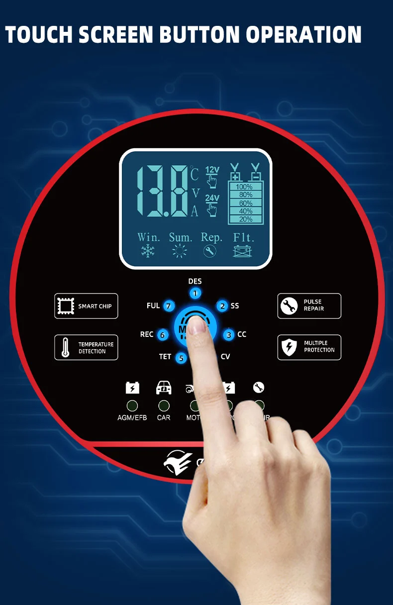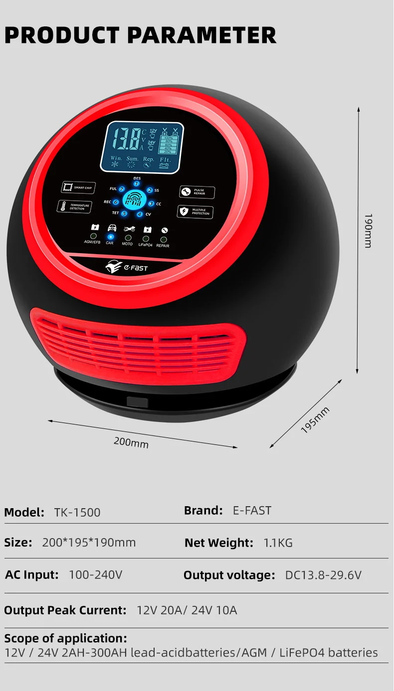 Kargagailu honek diseinu trinko berritzailea du eta definizio altuko LCD pantaila batekin hornituta dago, tentsioa, korrontea, tenperatura, kargaren aurrerapena eta bateriaren egoera denbora errealean erakusten dituena, funtzionamendua begirada batean argi utziz. Bateriak zahartutako bateriak aktibatu eta konpondu ditzakeen pultsu konponketa funtzioa du barneratuta, haien bizitza luzatuz. Kargagailu adimendun guztiz automatikoa denez, TK-1500-k "entxufatu eta ahaztu" funtzionamendua onartzen du: bateriaren tentsioa automatikoki detektatzen du, kargatzeko modua hautatzen du eta karga osoa kargatu ondoren kargatzeko mantentze-modu batera aldatzen du gainkarga saihesteko. Denbora luzez aparkatuta dauden ibilgailuen edo sasoiko ekipamenduen bateriaren mantentze-lanetarako aproposa da, hala nola, belarra mozteko eta itsasontziak.
