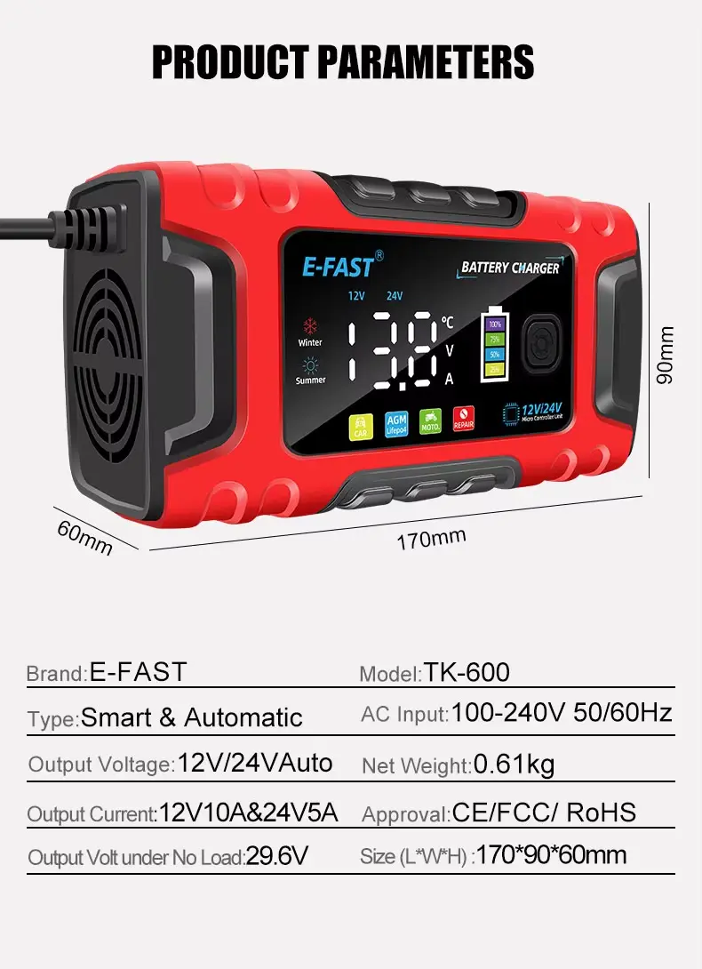 Kalitate handiko E-Fast TK-600 guztiz automatikoa Pulse Repair Technology 12V10A 24V5A berun azido lifepo4 bateria kargagailua autorako |