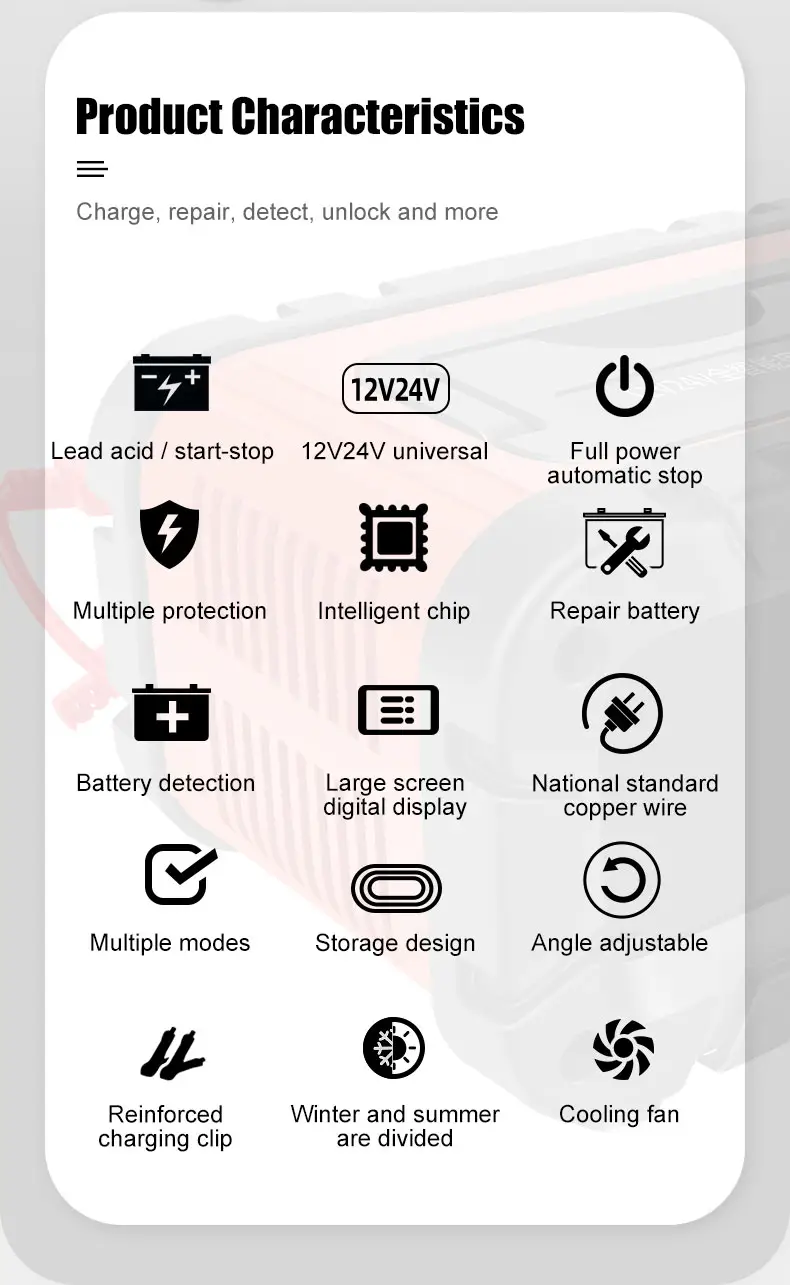 TK700 unibertsala 12V 24V berun-azidozko bateria kargagailua Txinan fabrikatzaile eta hornitzaile profesionala den Starwell-eko TK700 kargatzeko sistema adimendun handiko errendimendu handiko karga-sistema da berun-azido bateria askorentzat diseinatua. Automobilgintza, itsas, industria eta larrialdietarako energia-aplikazioetarako eraikia, tentsio-hautemate automatikoa, konponketa-teknologia aurreratua eta irteera-kontrol egonkorra konbinatzen ditu, energia berreskuratze fidagarria eta epe luzerako bateriaren mantentze-lanak bermatzeko. TK700 12V 24V Berun Azidoaren bateria-kargagailu unibertsala unitate trinko batean karga azkarra eta mantentze sakona emateko diseinatuta dago.